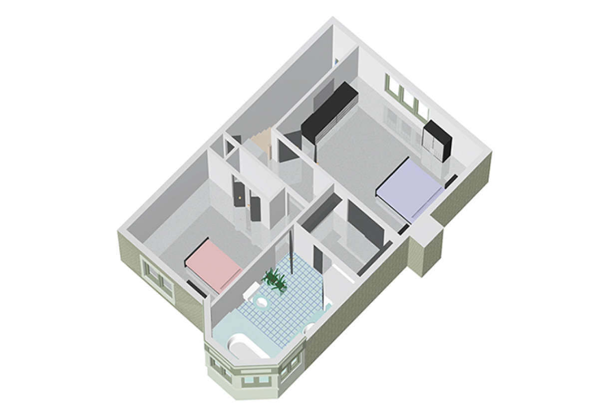 Двухэтажный проект дома позволяет рационально распорядиться площадью участка небольшого размера или узкой формы. На первом этаже находятся общие комнаты (гостиная/столовая, кухня, подсобные и технические помещения), на втором — спальни членов семьи.