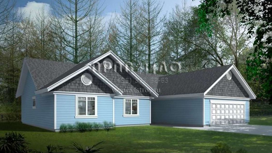 Это проект одноэтажного дома с гаражом на две машины жилой площадью 133 кв.м. Длина дома 14 м, ширина 16.5 м, высота 5.2 м. В доме три спальни и два санузла.