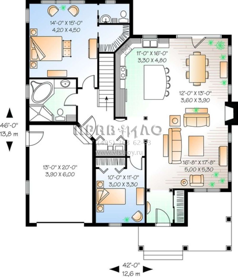 S5-135 (034-00645) Это иностранный проект, для которого требуется адаптация под нормы, действующие в Российской Федерации. Вы видите проект дома в стиле Ранчо. В этом доме сочетаются черты сельской постройки и аскетичность лофта. Внутри жильцы смогут проводить время с максимальным комфортом. Обратим внимание, что сейчас на планировках все размеры представлены в футах. Для перевода в метры вам необходимо значение в футах умножить на 0,3048.