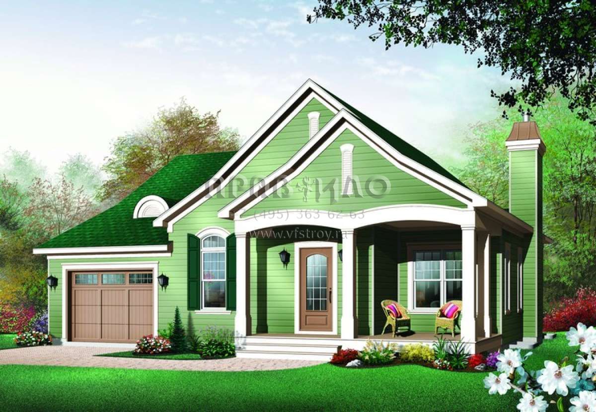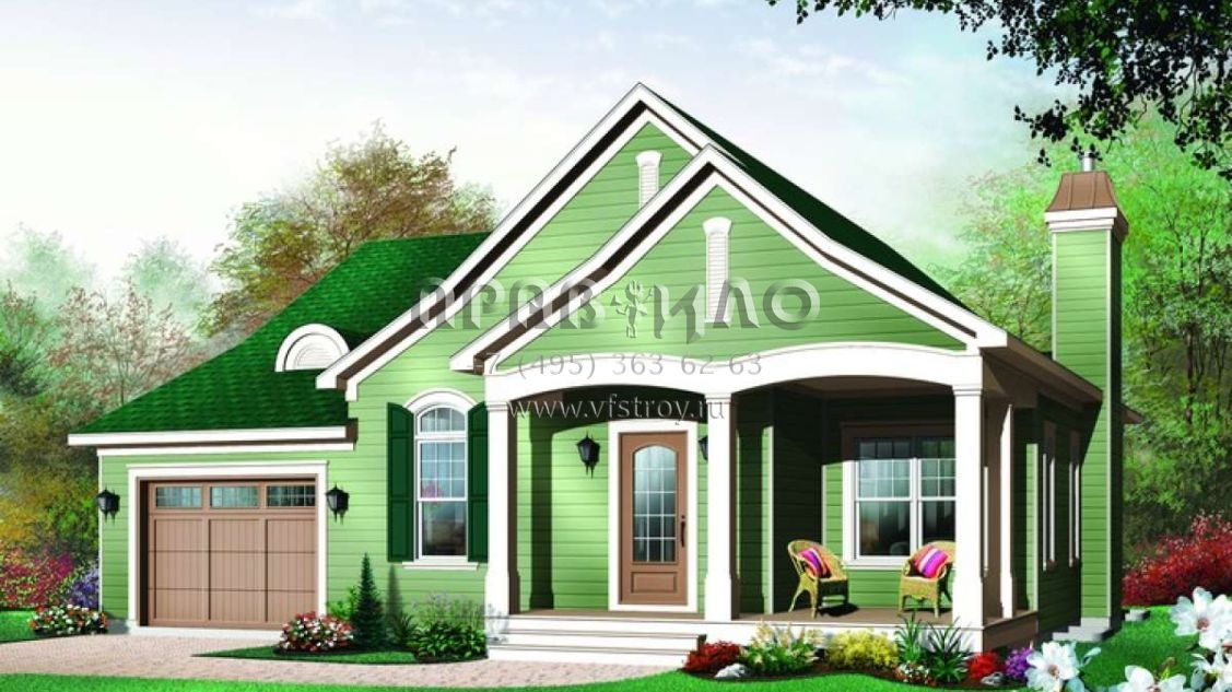Это проект одноэтажного дома с гаражом на одну машину жилой площадью 135 кв.м. Длина дома 14 м, ширина 12.8 м, высота 6.7 м. В доме две спальни и один санузел.