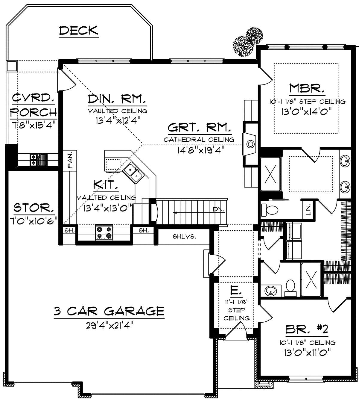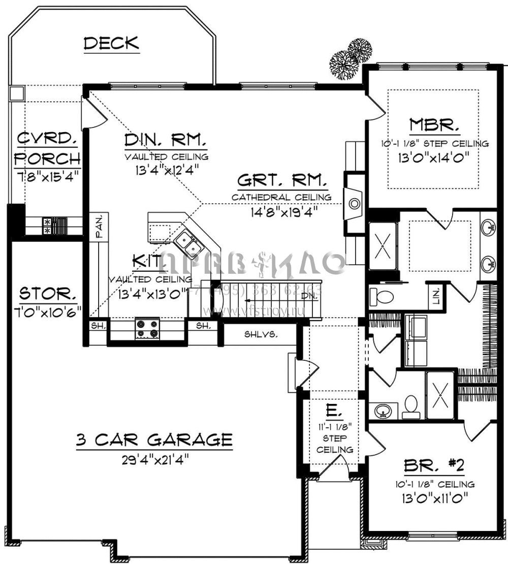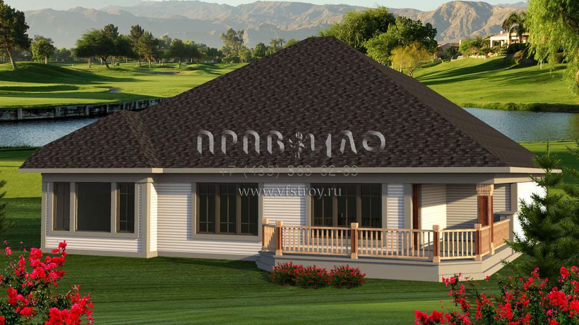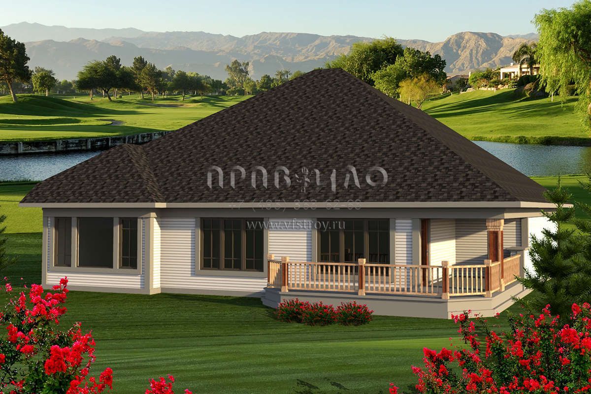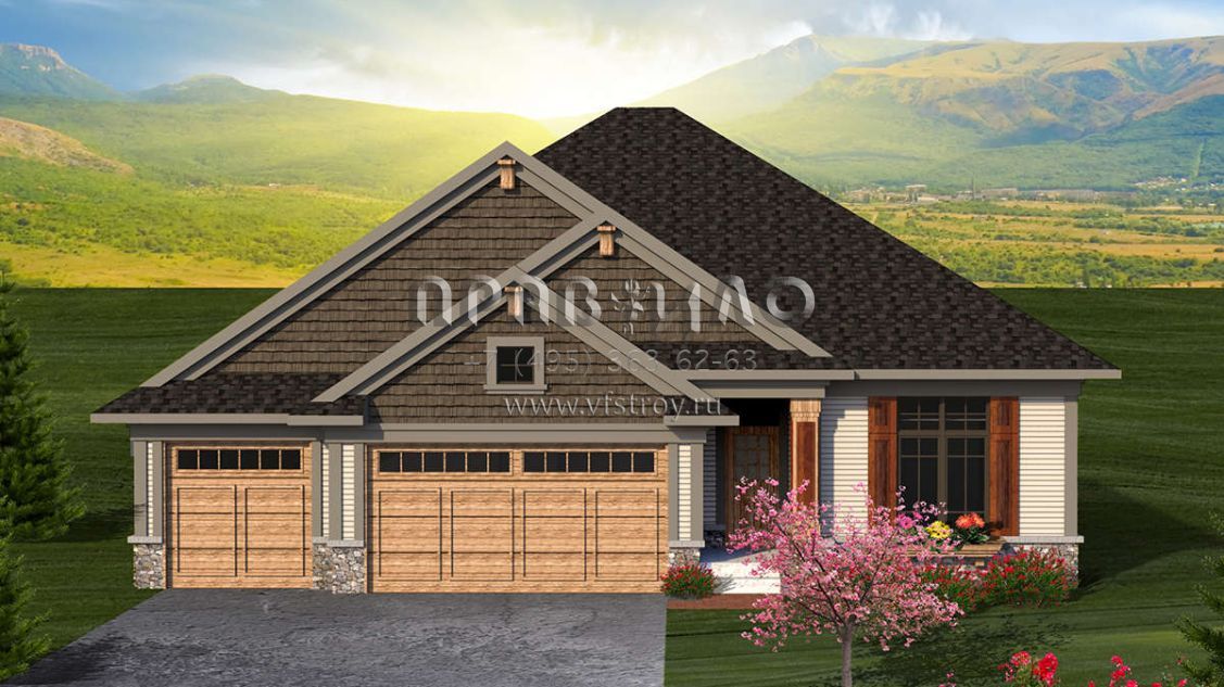 Это проект одноэтажного дома с гаражом на три и более машин жилой площадью 136 кв.м. Длина дома 15.2 м, ширина 15.2 м, высота 7.9 м. В доме две спальни и два санузла.