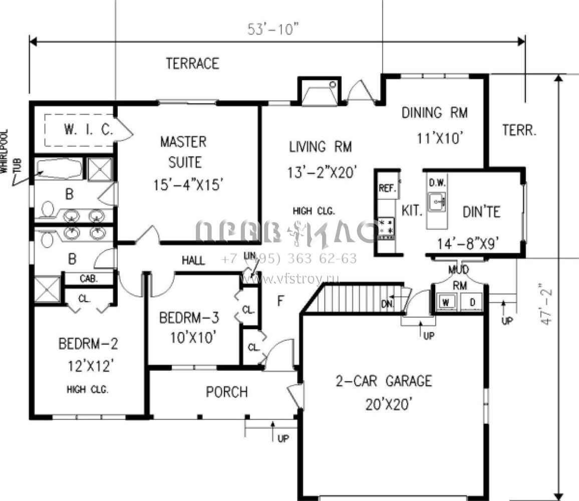 S5-137 (033-00069) Это иностранный проект, для которого требуется адаптация под нормы, действующие в Российской Федерации. Вы видите проект дома в стиле Ранчо. В этом доме сочетаются черты сельской постройки и аскетичность лофта. Внутри жильцы смогут проводить время с максимальным комфортом. Обратим внимание, что сейчас на планировках все размеры представлены в футах. Для перевода в метры вам необходимо значение в футах умножить на 0,3048.