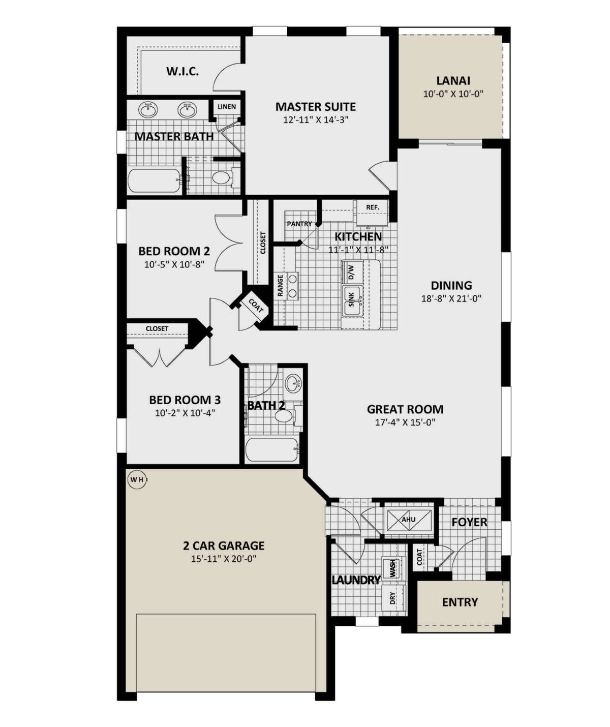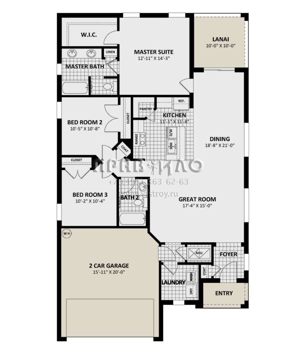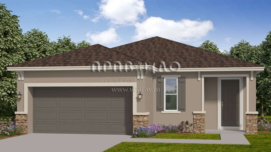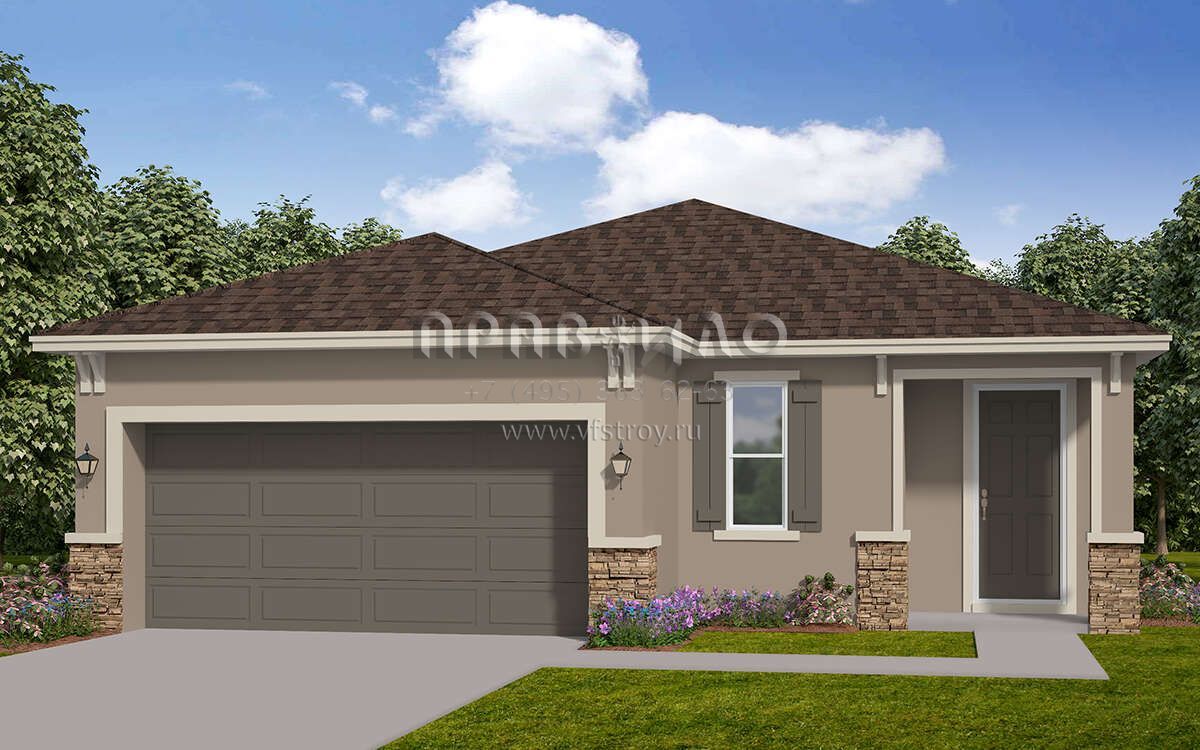 Это проект одноэтажного дома с гаражом на две машины жилой площадью 137 кв.м. Длина дома 18.3 м, ширина 10.7 м, высота 5.2 м. В доме три спальни и два санузла.