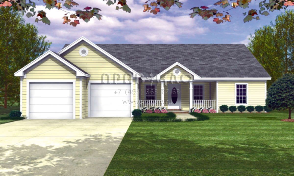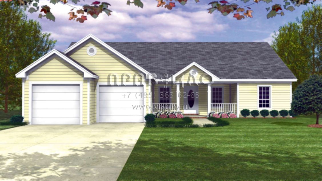 Это проект одноэтажного дома с гаражом на две машины жилой площадью 138 кв.м. Длина дома 14.6 м, ширина 16.5 м, высота 5.8 м. В доме три спальни и два санузла.