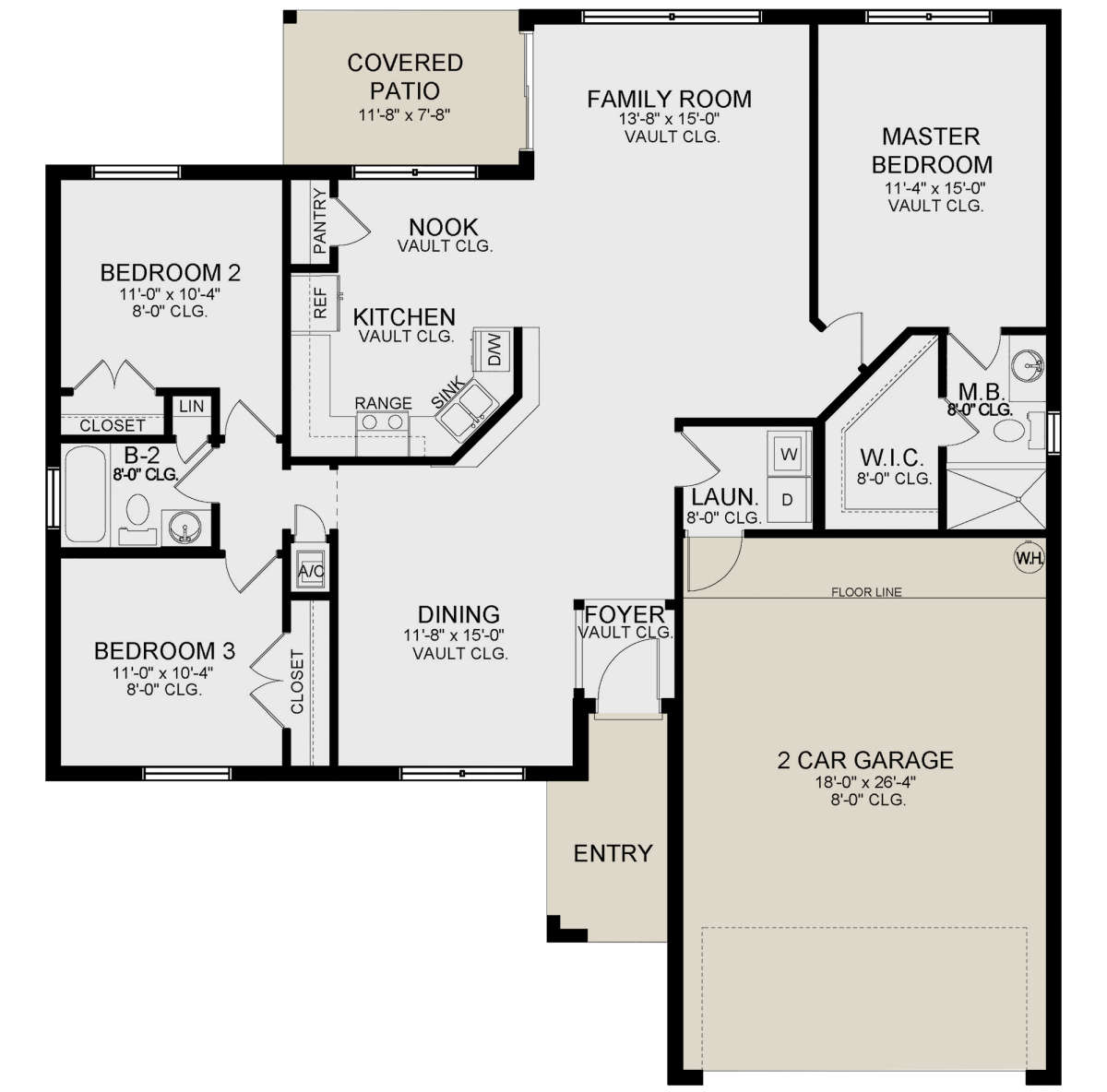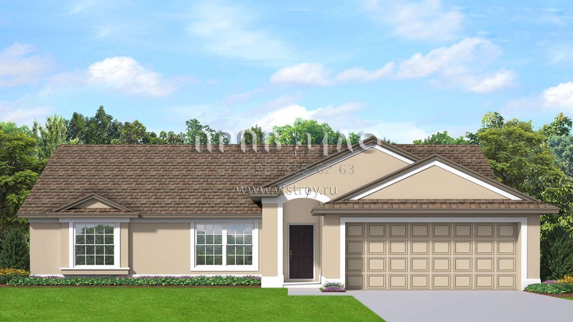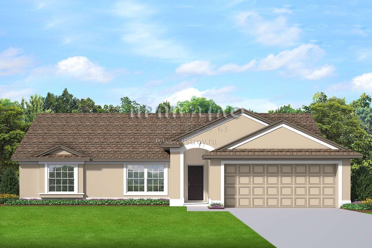 Это проект одноэтажного дома с гаражом на две машины жилой площадью 138 кв.м. Длина дома 16.2 м, ширина 15.2 м, высота 5.2 м. В доме три спальни и два санузла.