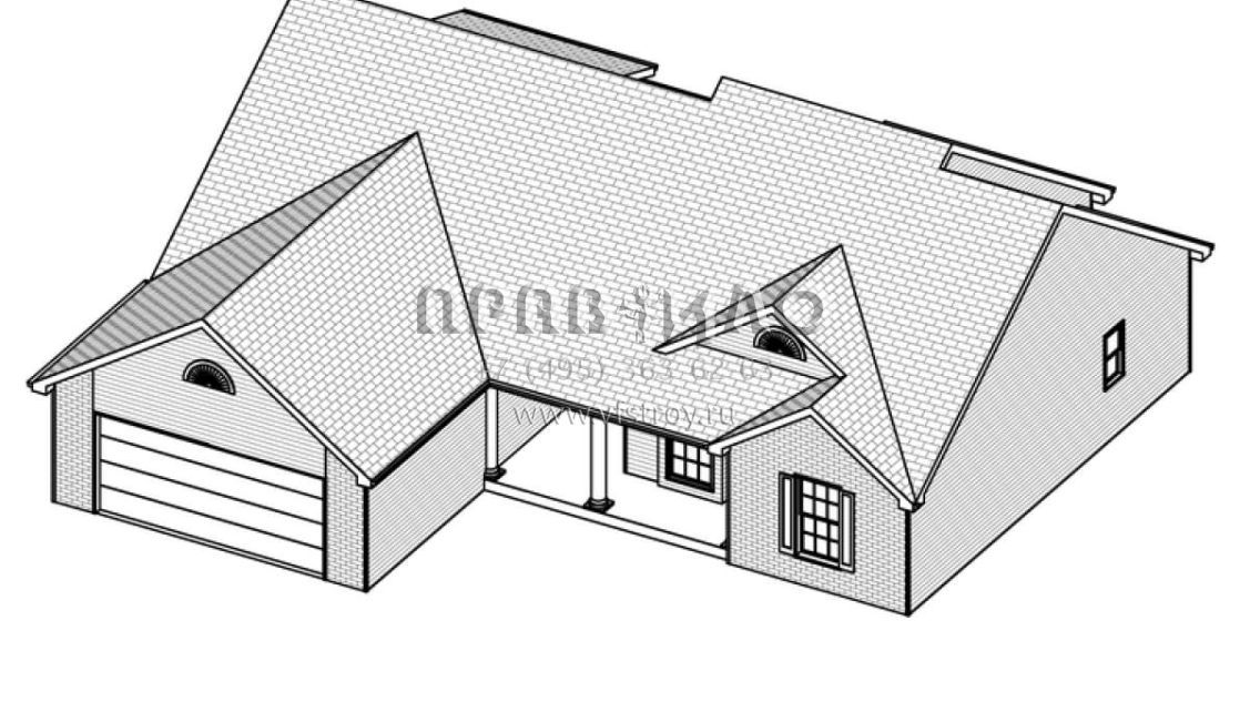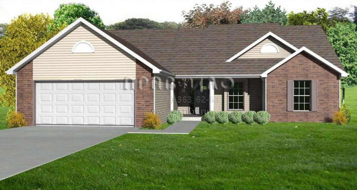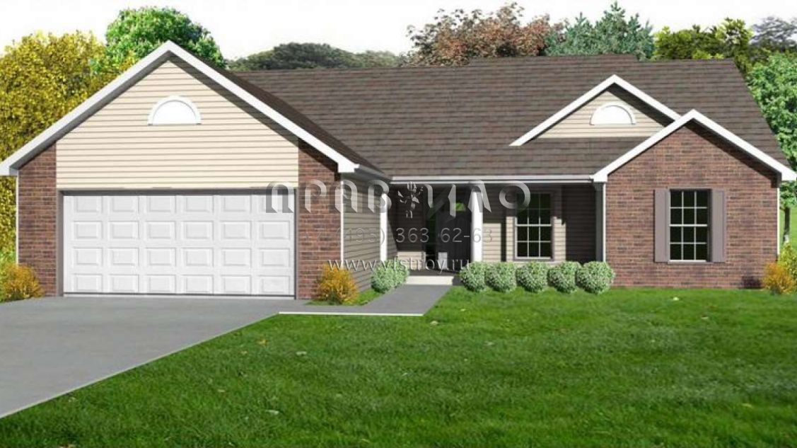 Это проект одноэтажного дома с гаражом на две машины жилой площадью 138 кв.м. Длина дома 14.9 м, ширина 15.8 м, высота 6.4 м. В доме три спальни и два санузла.