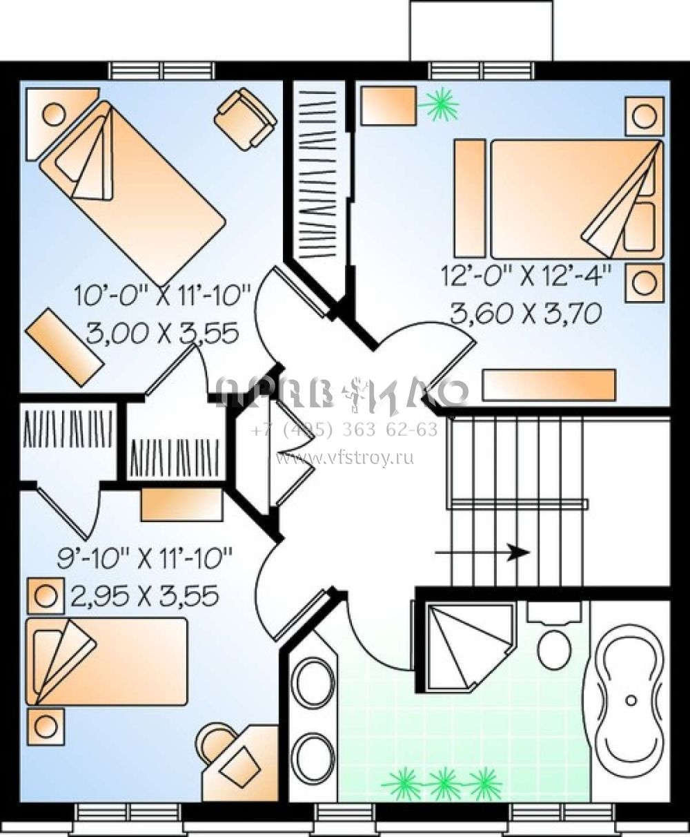 Это проект двухэтажного дома без гаража жилой площадью 139 кв.м. Длина дома 8.8 м, ширина 7.9 м, высота 8.8 м. В доме три спальни и один санузел.