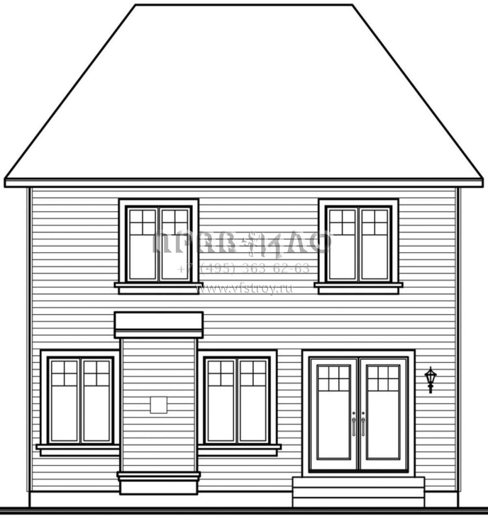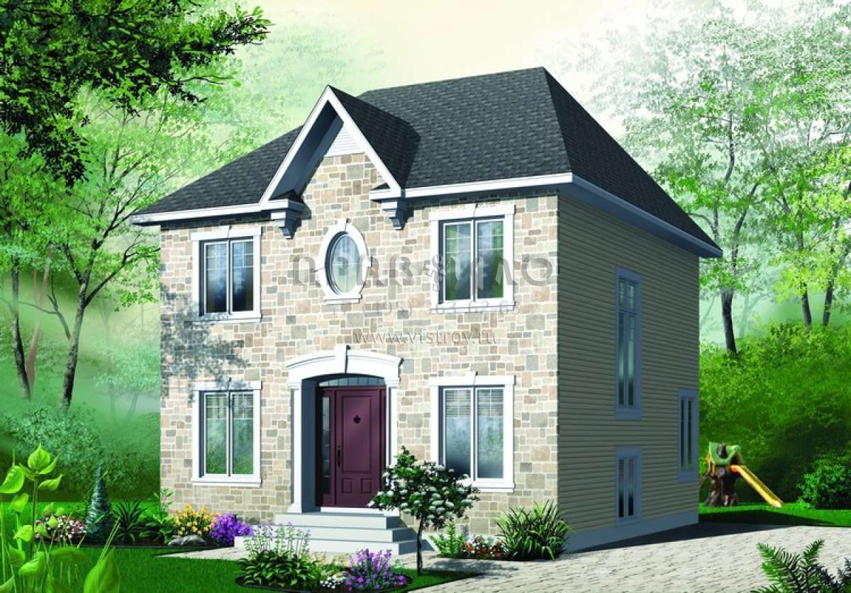 Двухэтажный проект дома позволяет рационально распорядиться площадью участка небольшого размера или узкой формы. На первом этаже находятся общие комнаты (гостиная/столовая, кухня, подсобные и технические помещения), на втором — спальни членов семьи.