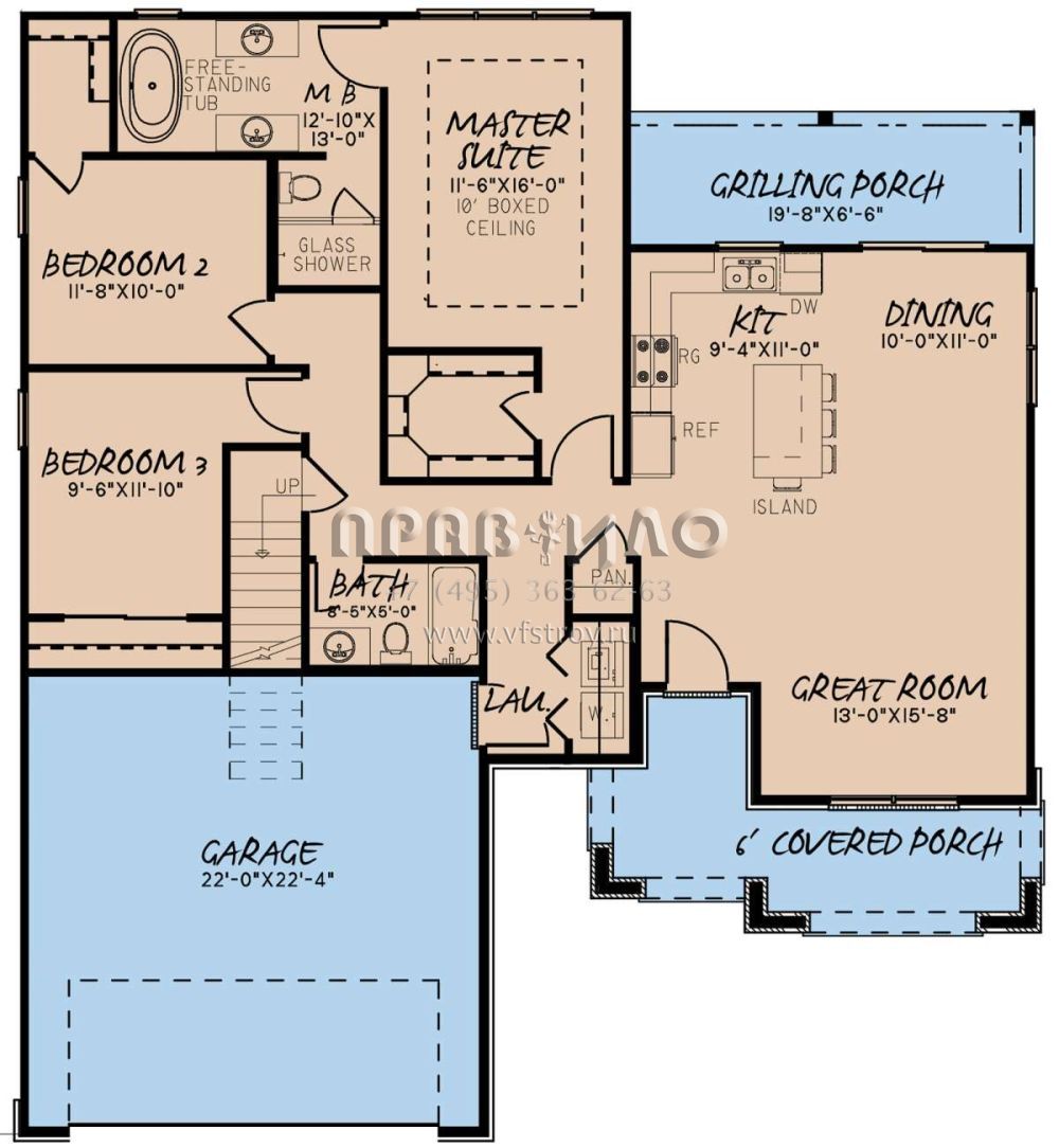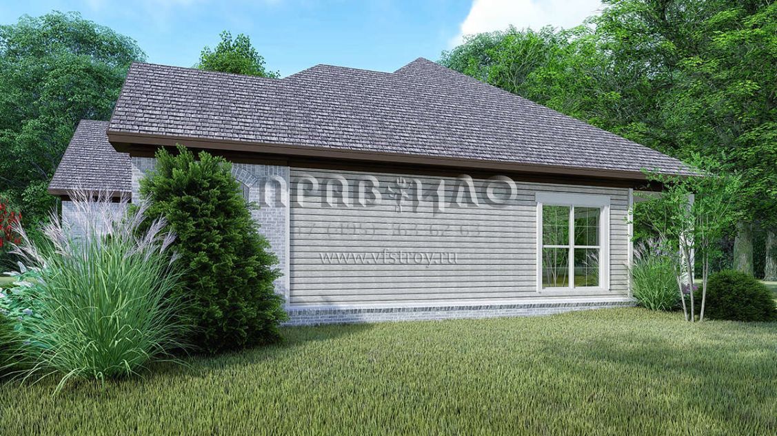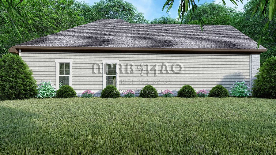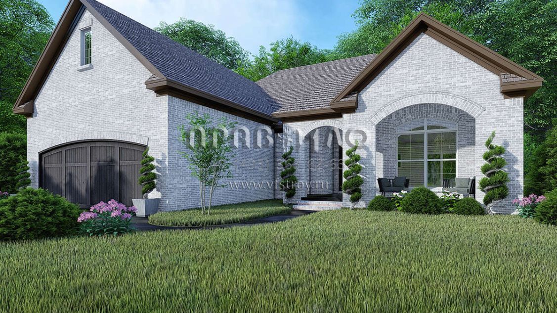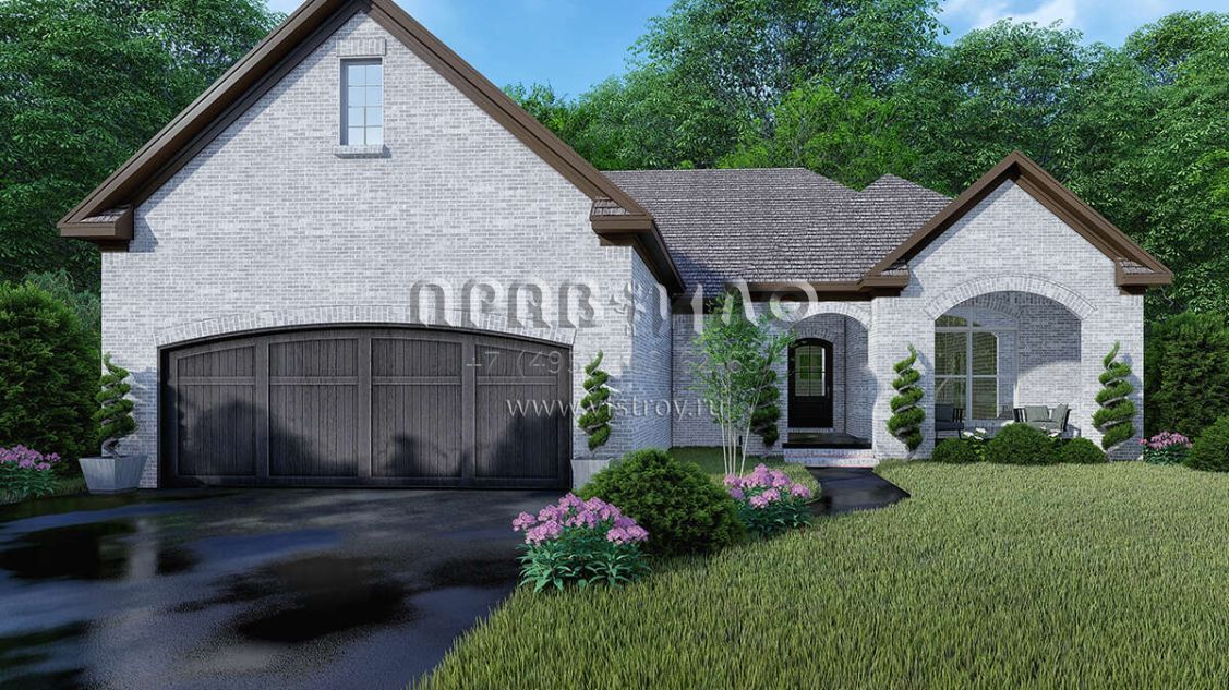 Это проект одноэтажного дома с гаражом на две машины жилой площадью 139 кв.м. Длина дома 16.5 м, ширина 14.9 м, высота 7 м. В доме три спальни и два санузла.