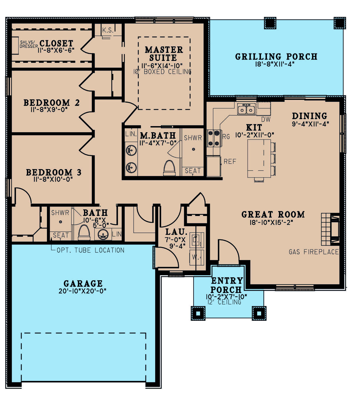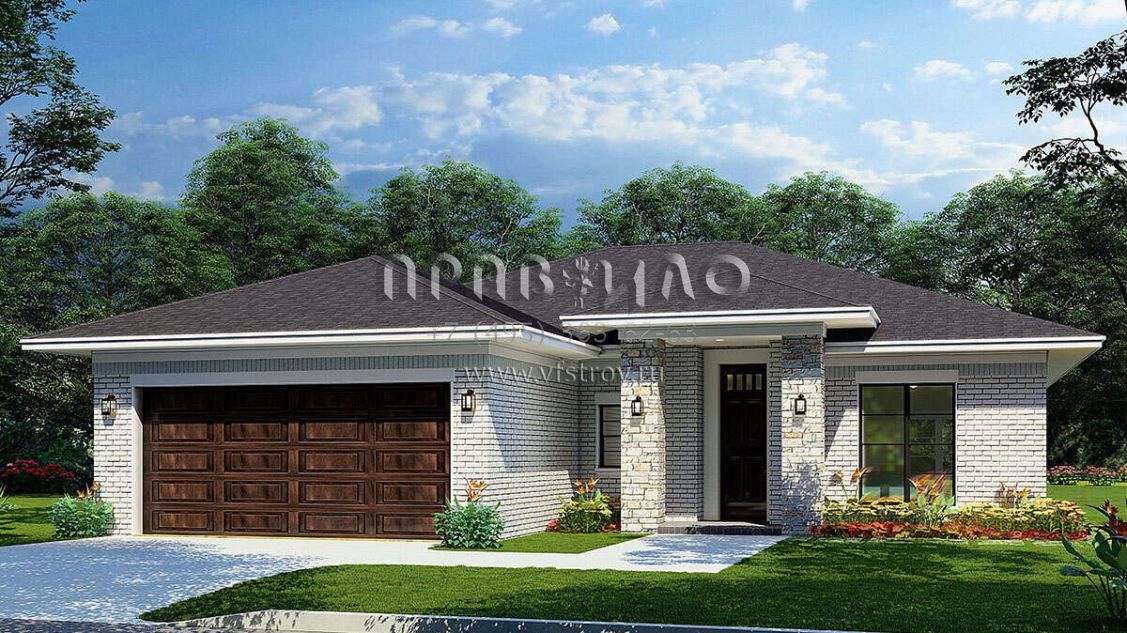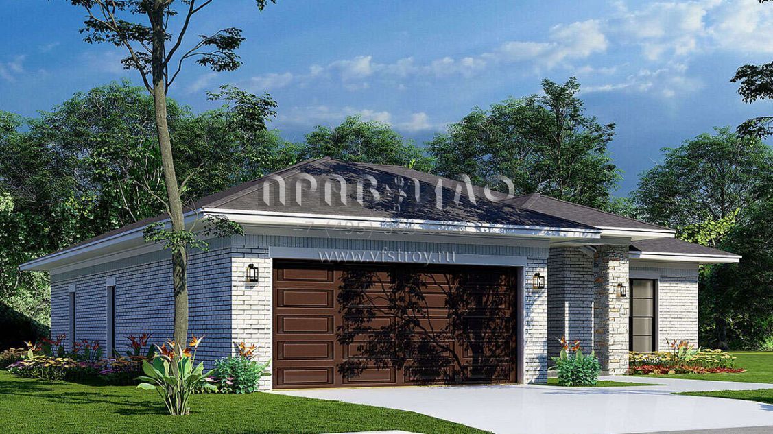 Это проект одноэтажного дома с гаражом на две машины жилой площадью 139 кв.м. Длина дома 16.2 м, ширина 14.6 м, высота 5.8 м. В доме три спальни и два санузла.