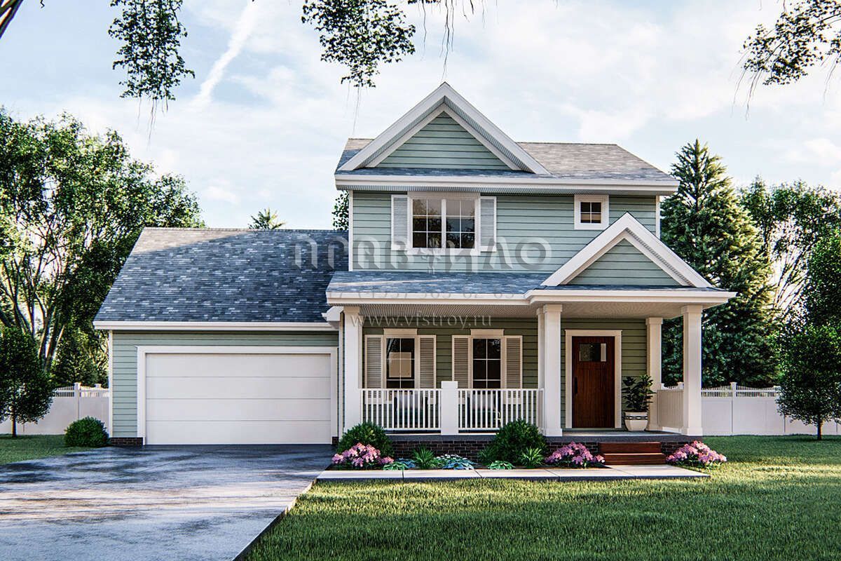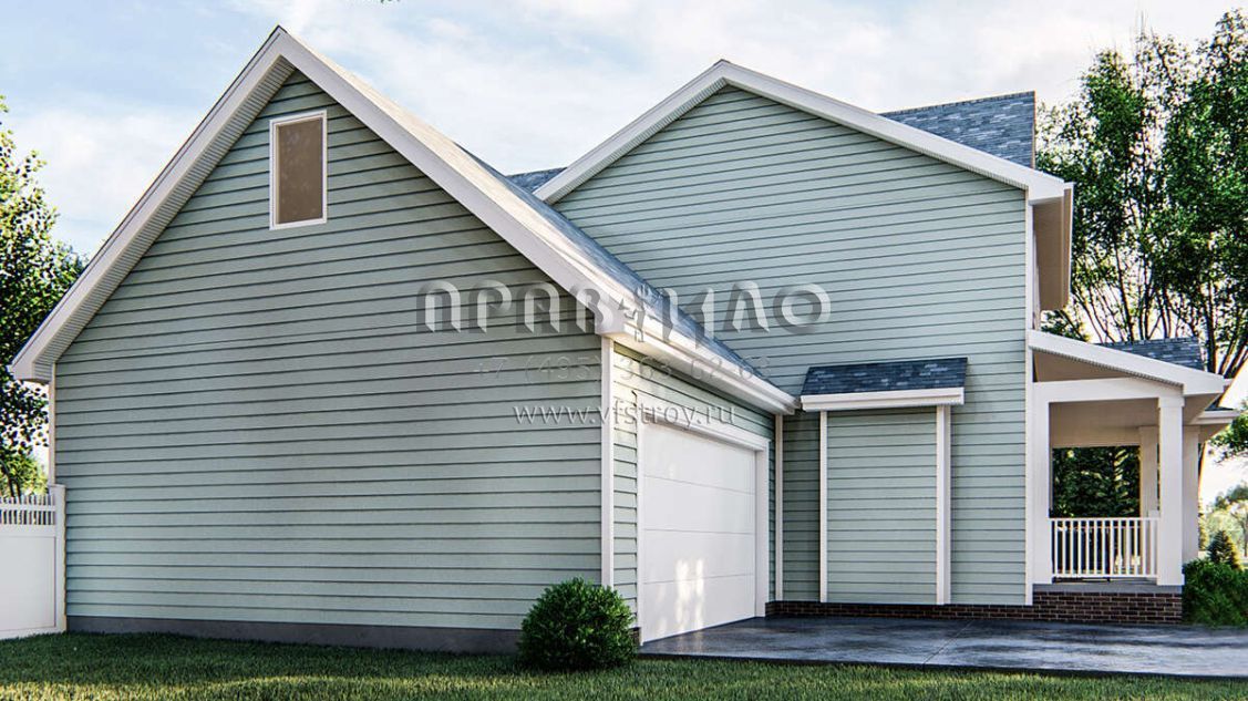 Это проект двухэтажного дома с гаражом на две машины жилой площадью 139 кв.м. Длина дома 13.4 м, ширина 13.4 м, высота 8.2 м. В доме три спальни и два санузла.