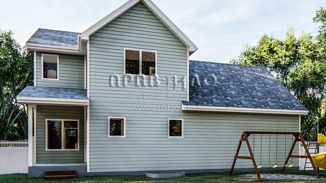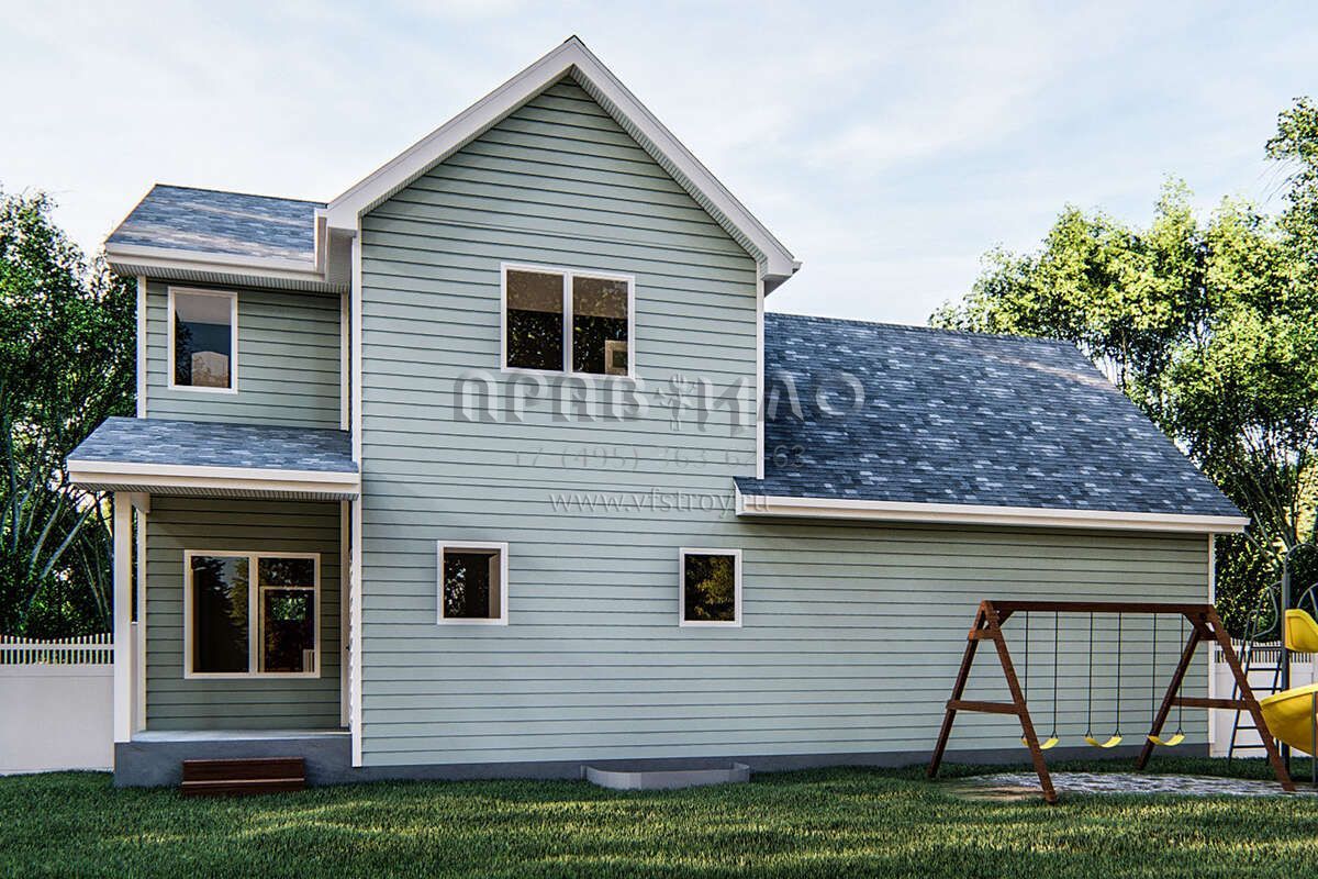 Двухэтажный проект дома позволяет рационально распорядиться площадью участка небольшого размера или узкой формы. На первом этаже находятся общие комнаты (гостиная/столовая, кухня, подсобные и технические помещения), на втором — спальни членов семьи.
