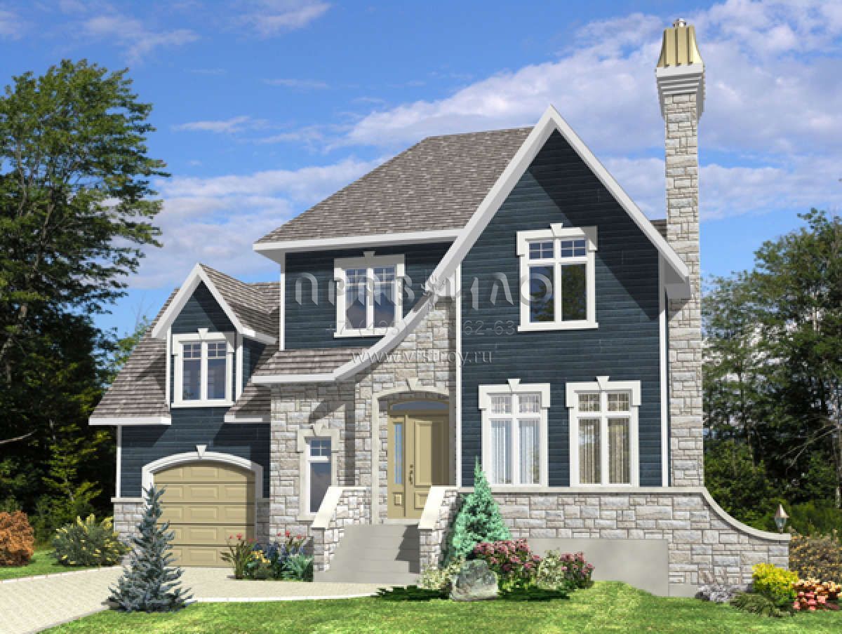 Это проект двухэтажного дома с гаражом на одну машину жилой площадью 140 кв.м. Длина дома 9.1 м, ширина 7.9 м, высота 10.4 м. В доме три спальни и один санузел.