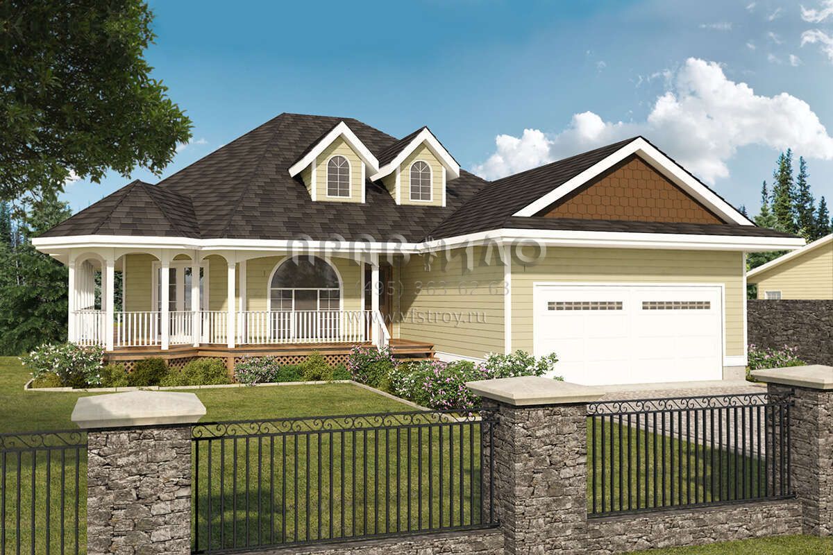 Это проект одноэтажного дома с гаражом на две машины жилой площадью 140 кв.м. Длина дома 17.7 м, ширина 14.6 м, высота 7.6 м. В доме три спальни и два санузла.