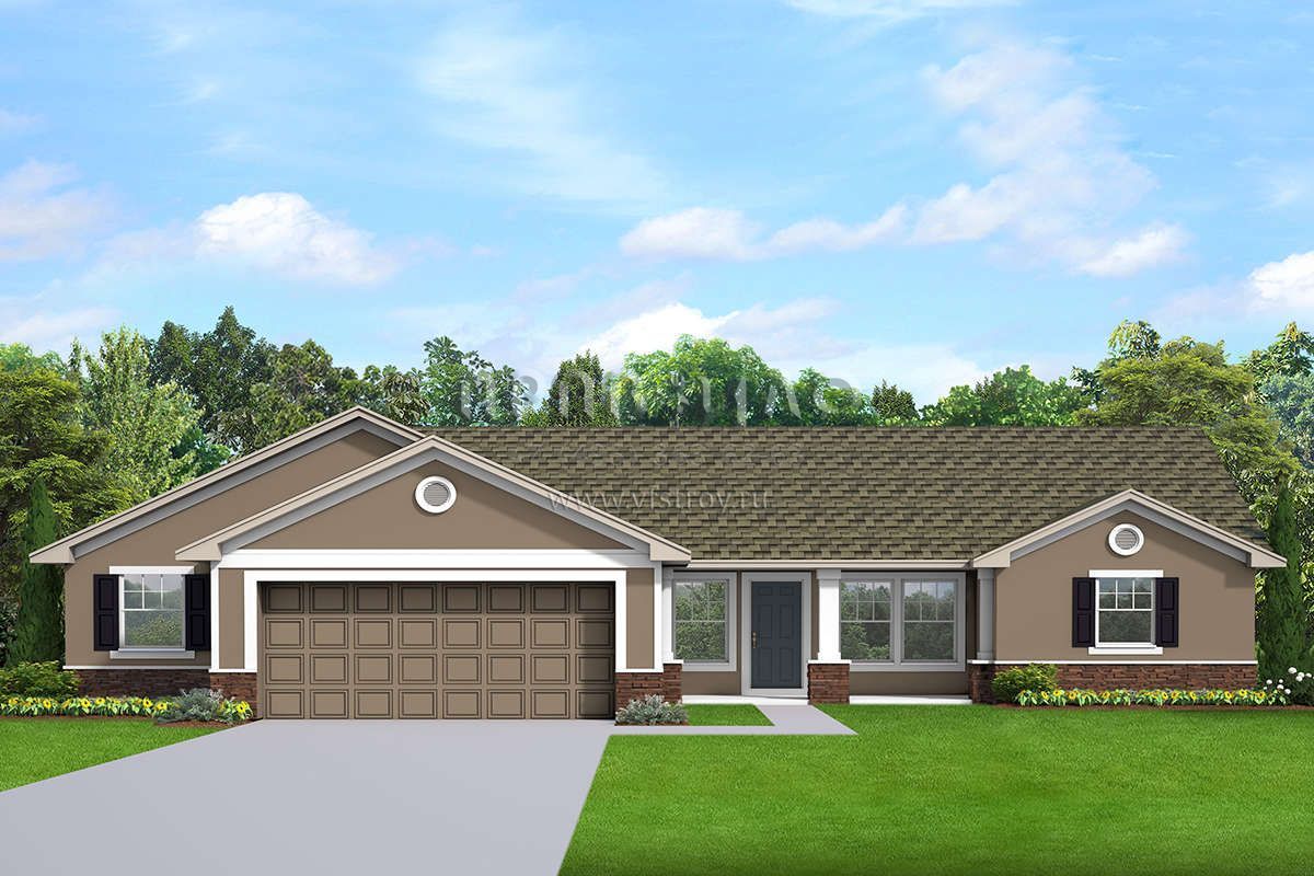 Это проект одноэтажного дома с гаражом на две машины жилой площадью 141 кв.м. Длина дома 18.6 м, ширина 17.7 м, высота 4.9 м. В доме три спальни и два санузла.