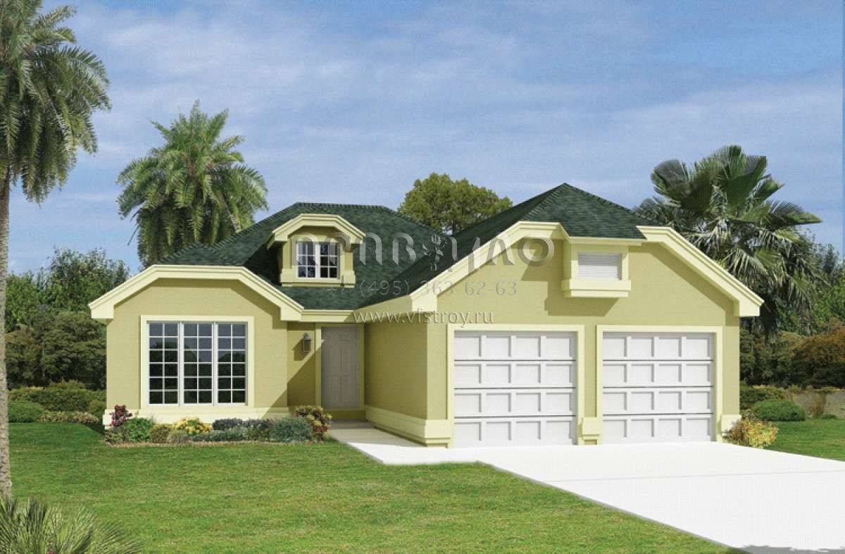 Это проект одноэтажного дома с гаражом на две машины жилой площадью 141 кв.м. Длина дома 18.9 м, ширина 12.2 м, высота 5.8 м. В доме три спальни и два санузла.