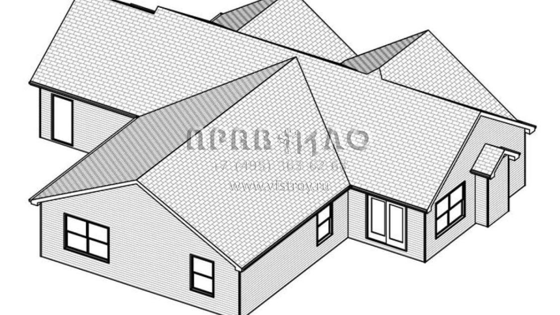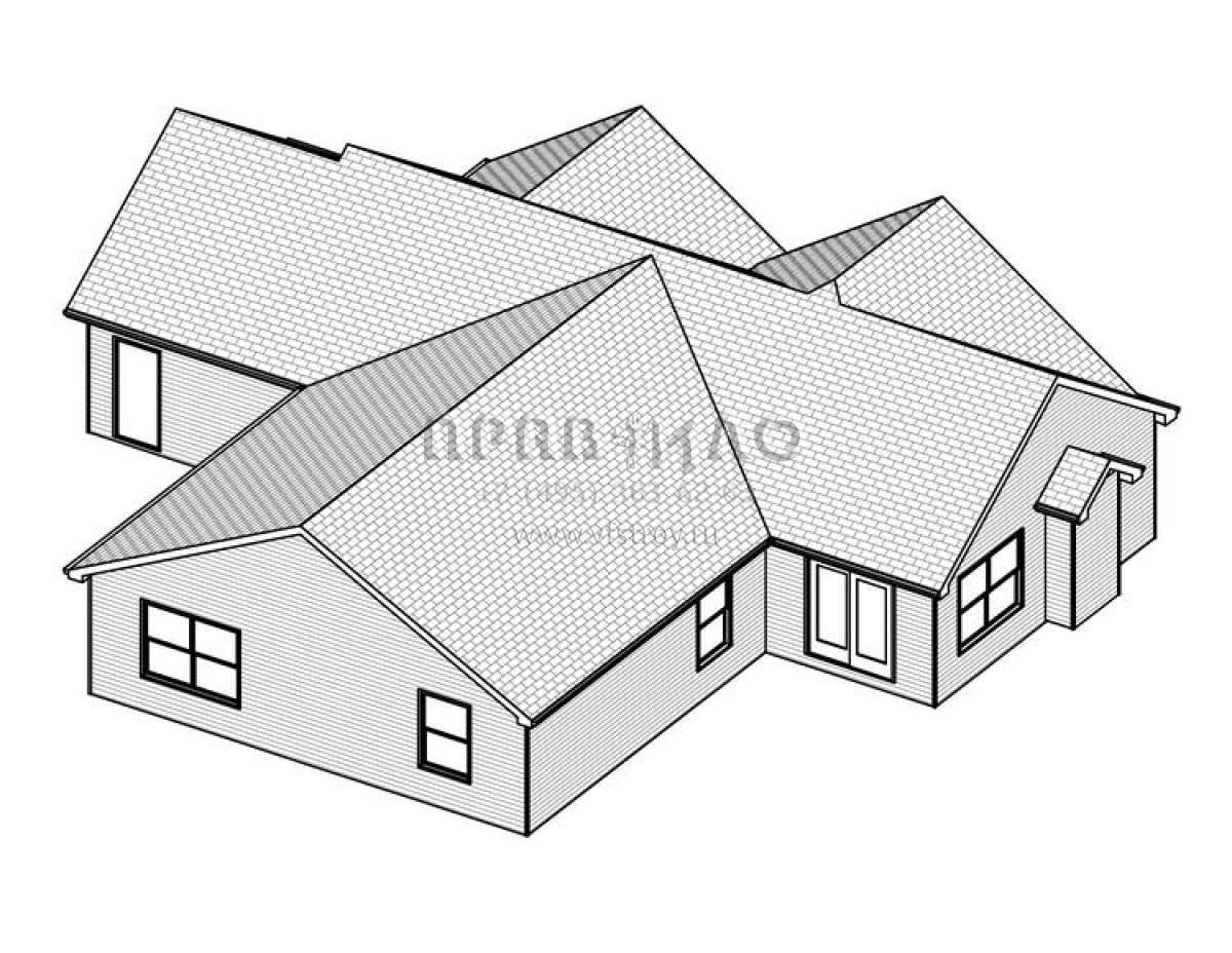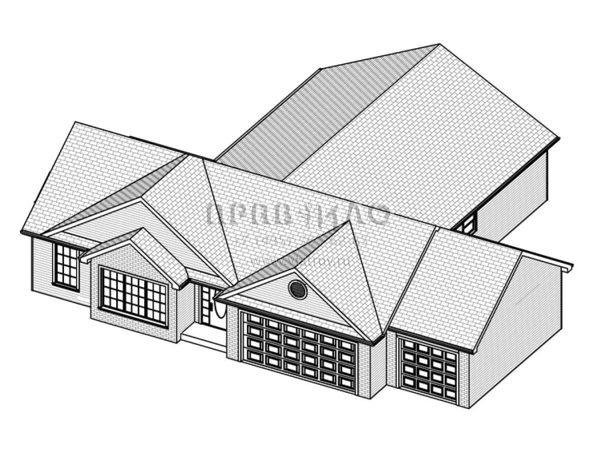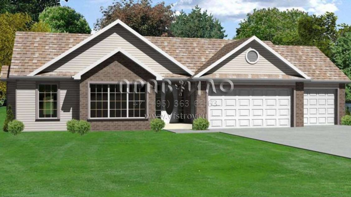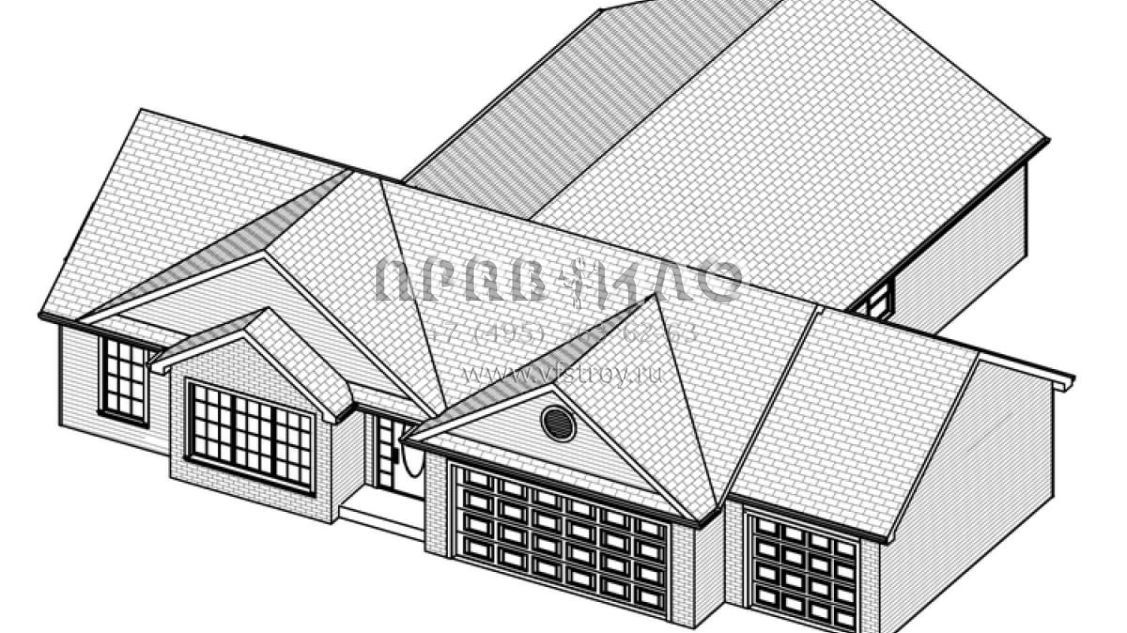 Это проект одноэтажного дома с гаражом на три и более машин жилой площадью 141 кв.м. Длина дома 15.8 м, ширина 18.3 м, высота 5.5 м. В доме три спальни и два санузла.