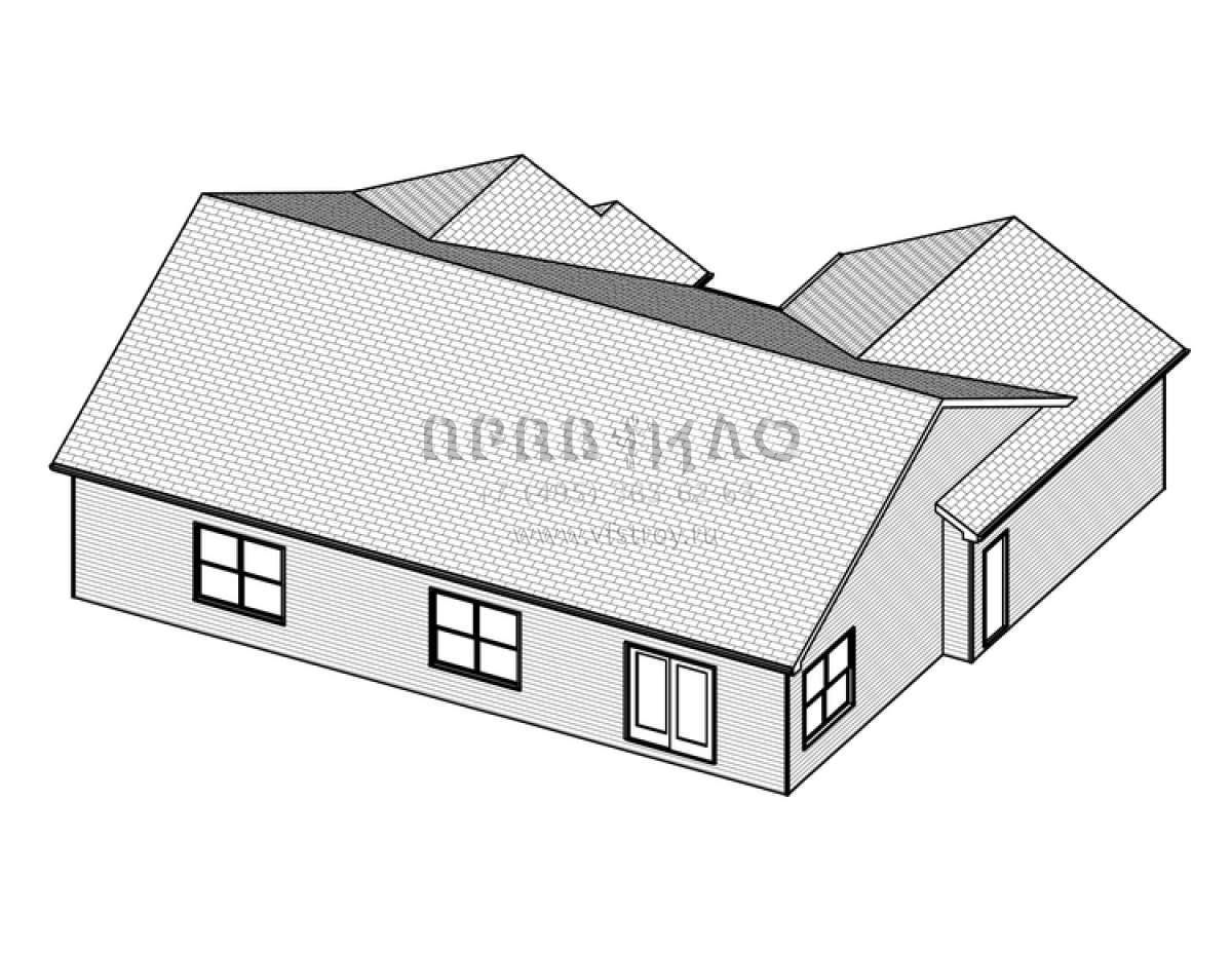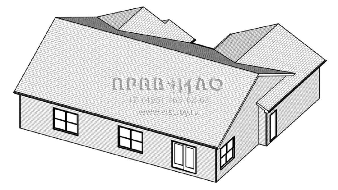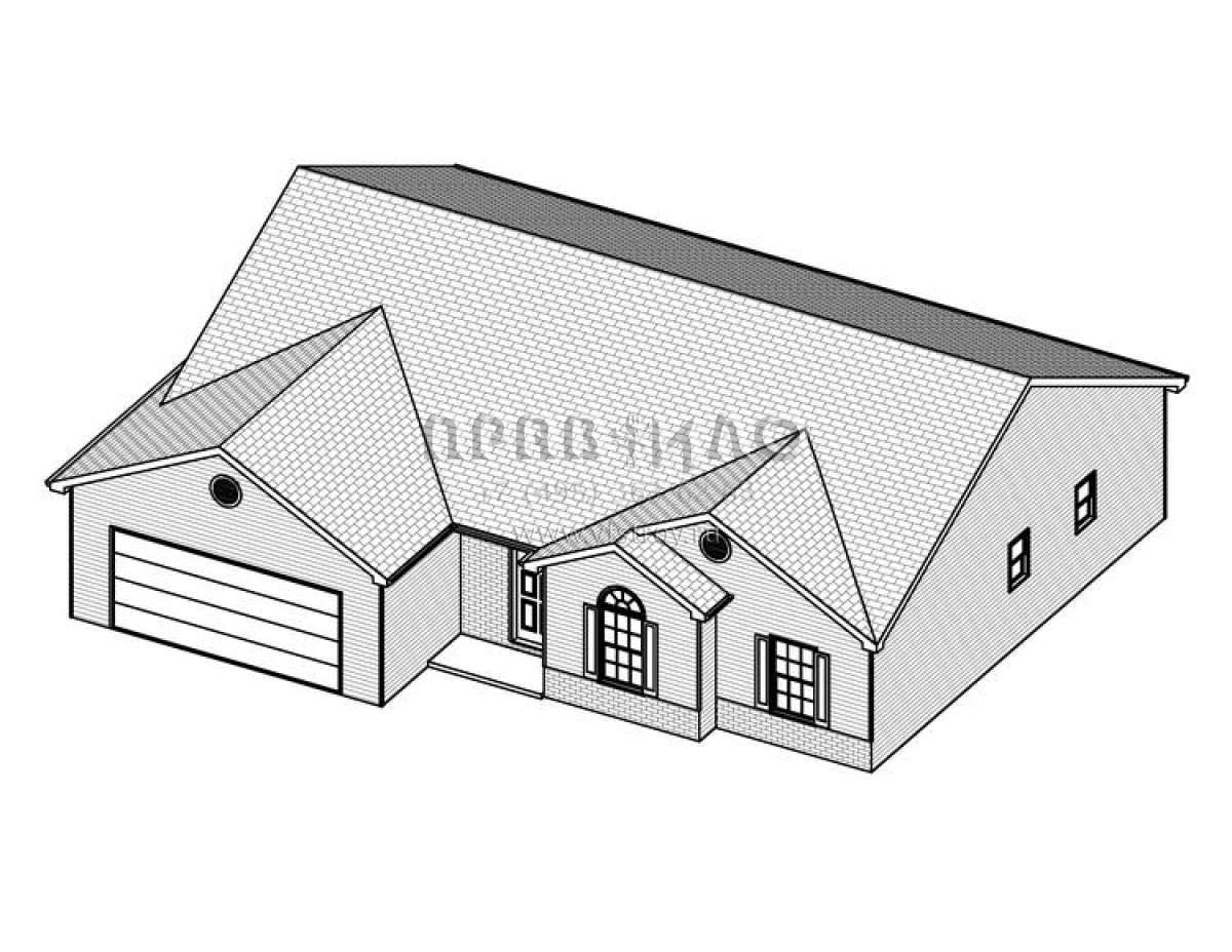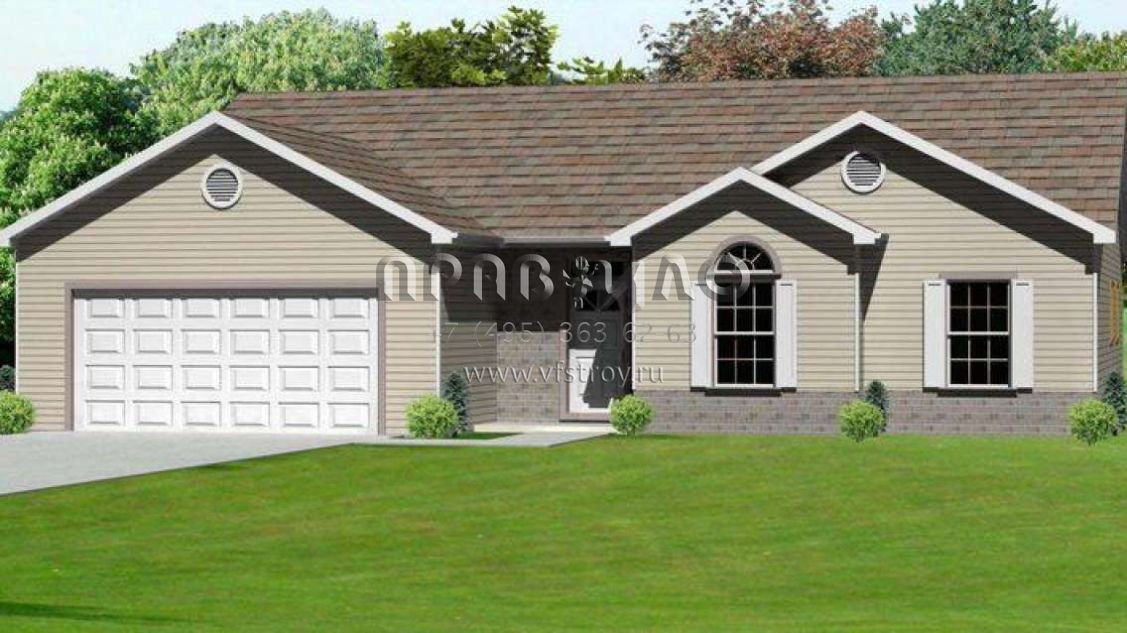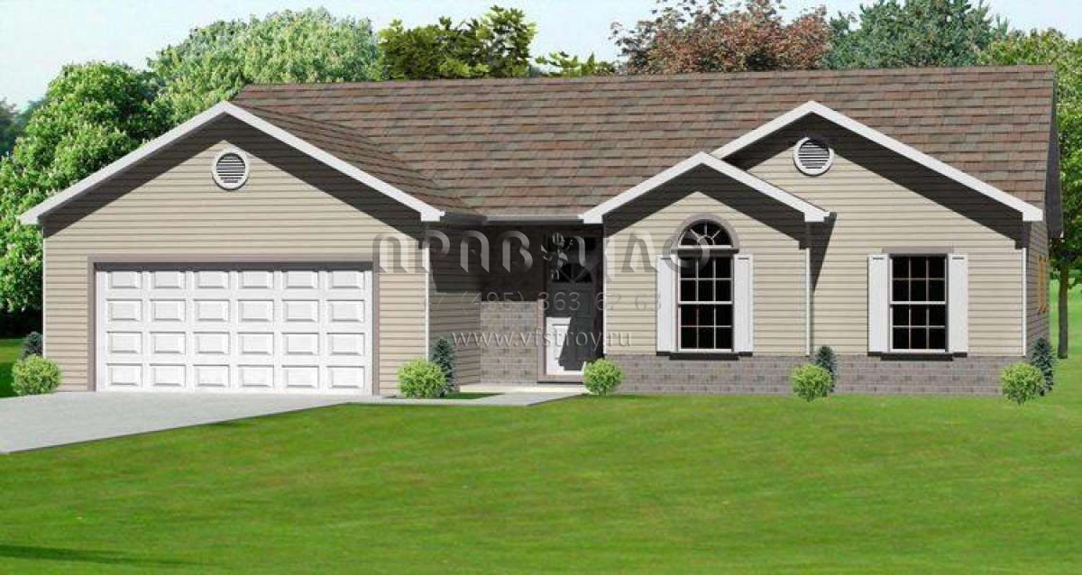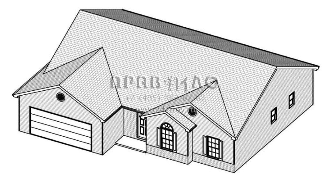 Это проект одноэтажного дома с гаражом на две машины жилой площадью 141 кв.м. Длина дома 13.4 м, ширина 15.8 м, высота 5.8 м. В доме три спальни и два санузла.