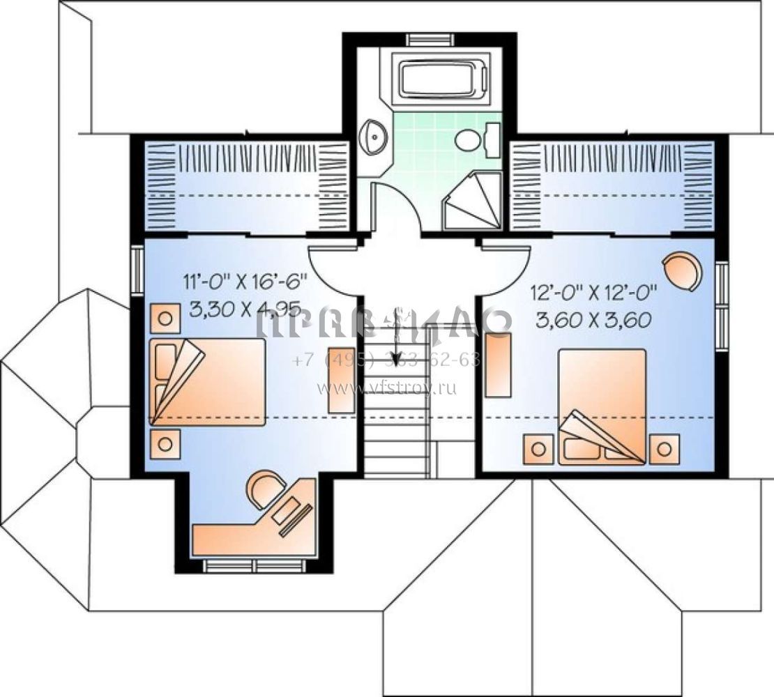 Это проект двухэтажного дома без гаража жилой площадью 143 кв.м. Длина дома 8.5 м, ширина 11 м, высота 7.9 м. В доме три спальни и два санузла.
