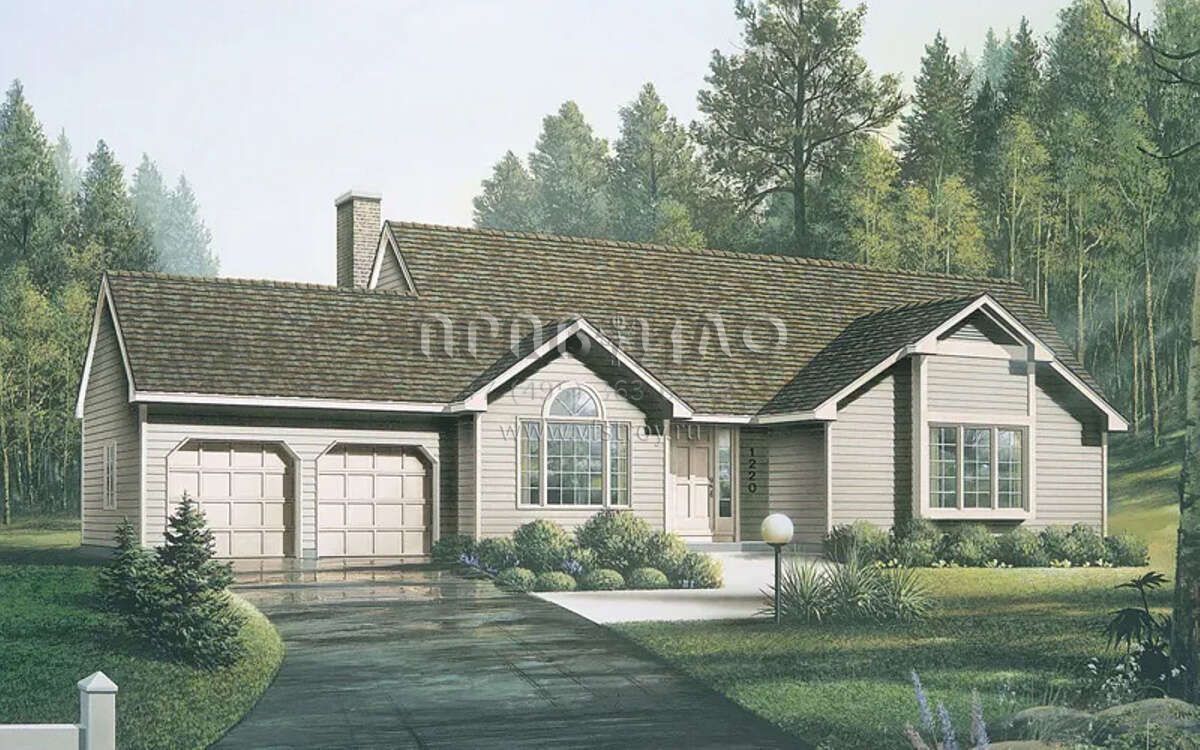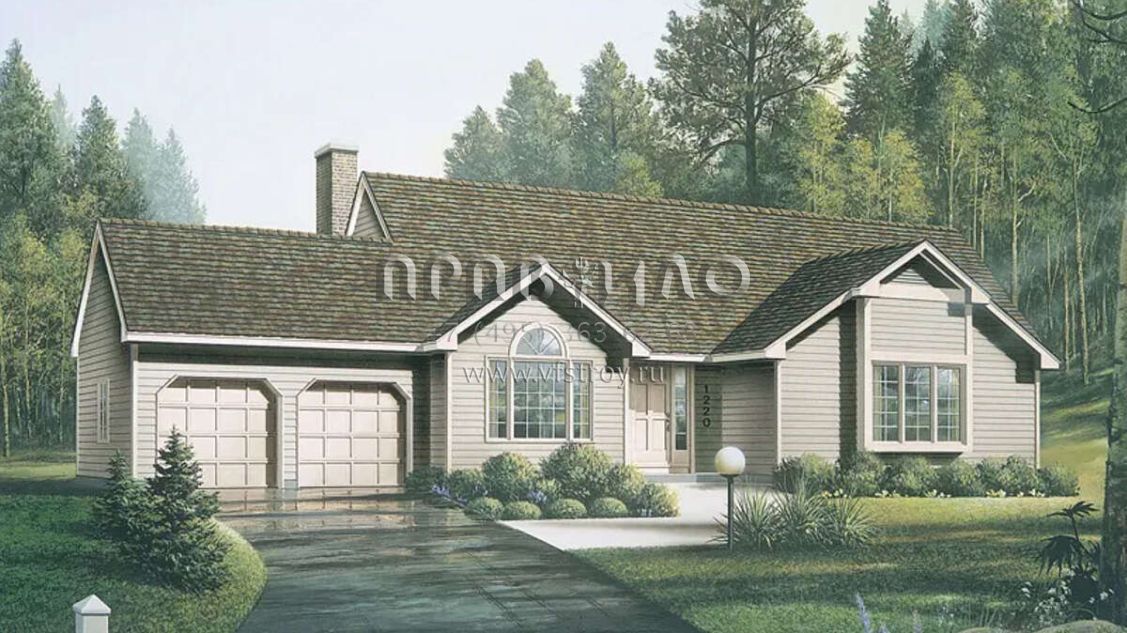 Это проект одноэтажного дома с гаражом на две машины жилой площадью 143 кв.м. Длина дома 11.6 м, ширина 20.1 м, высота 6.4 м. В доме три спальни и два санузла.