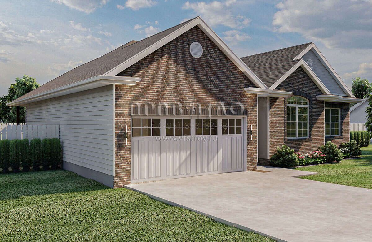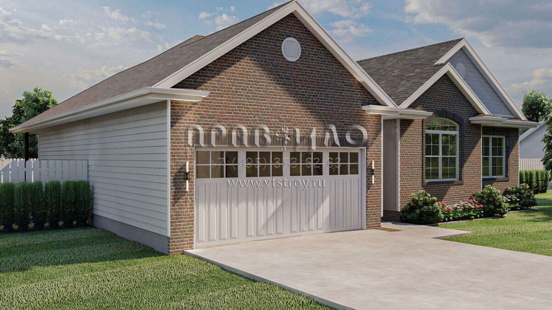 Это проект одноэтажного дома с гаражом на две машины жилой площадью 144 кв.м. Длина дома 17.1 м, ширина 14.9 м, высота 6.7 м. В доме три спальни и два санузла.