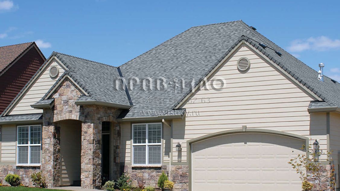 Это проект одноэтажного дома с гаражом на две машины жилой площадью 147 кв.м. Длина дома 15.2 м, ширина 15.2 м, высота 8.2 м. В доме три спальни и два санузла.