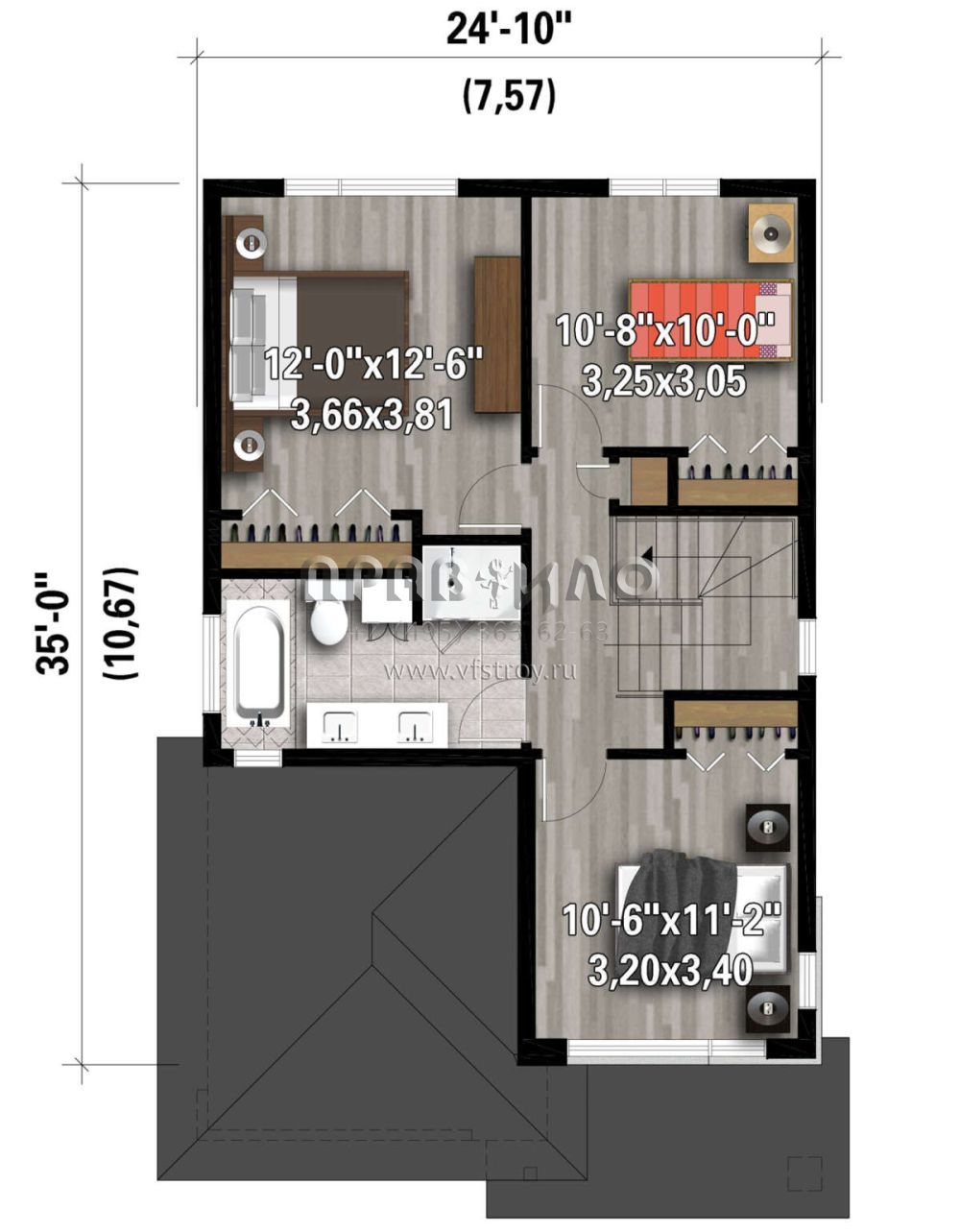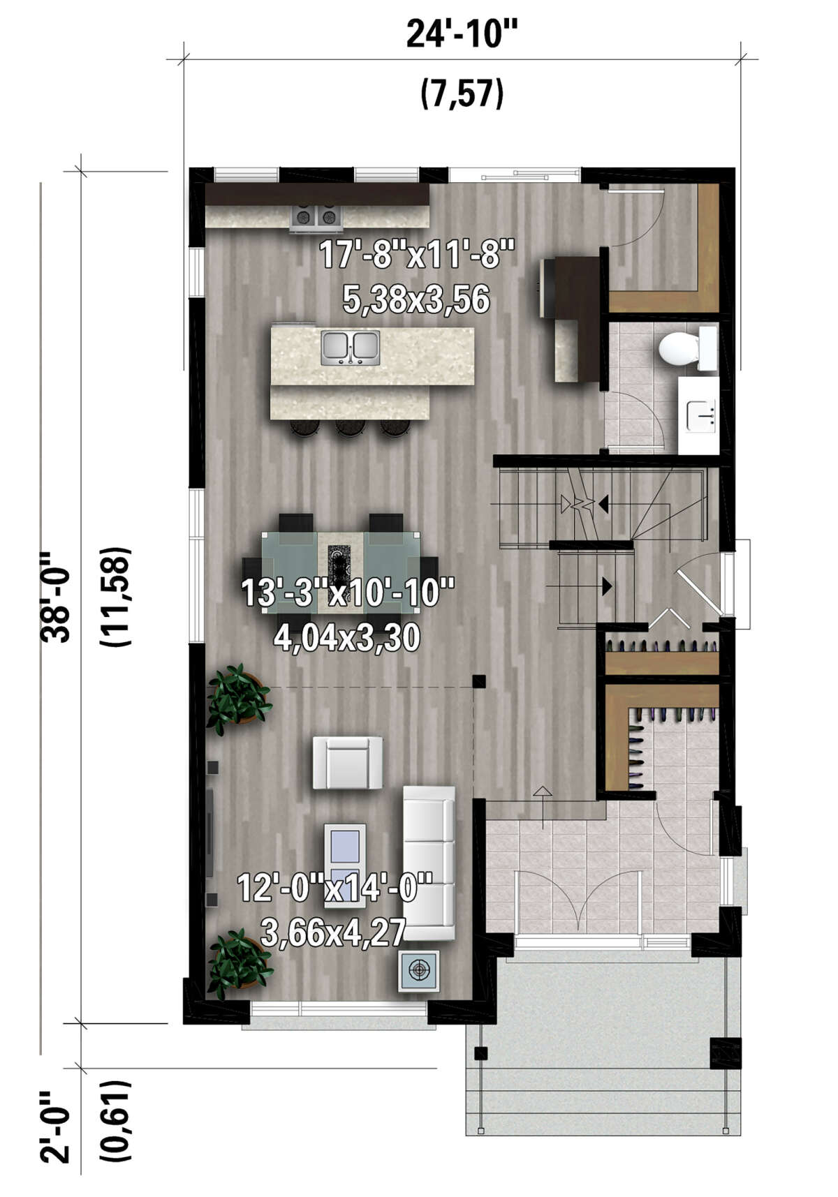 S5-147 (6146-00507) Это иностранный проект, для которого требуется адаптация под нормы, действующие в Российской Федерации. Вы видите проект дома в современном стиле. В этом доме сочетаются черты сельской постройки и аскетичность лофта. Внутри жильцы смогут проводить время с максимальным комфортом. Обратим внимание, что сейчас на планировках все размеры представлены в футах. Для перевода в метры вам необходимо значение в футах умножить на 0,3048.
