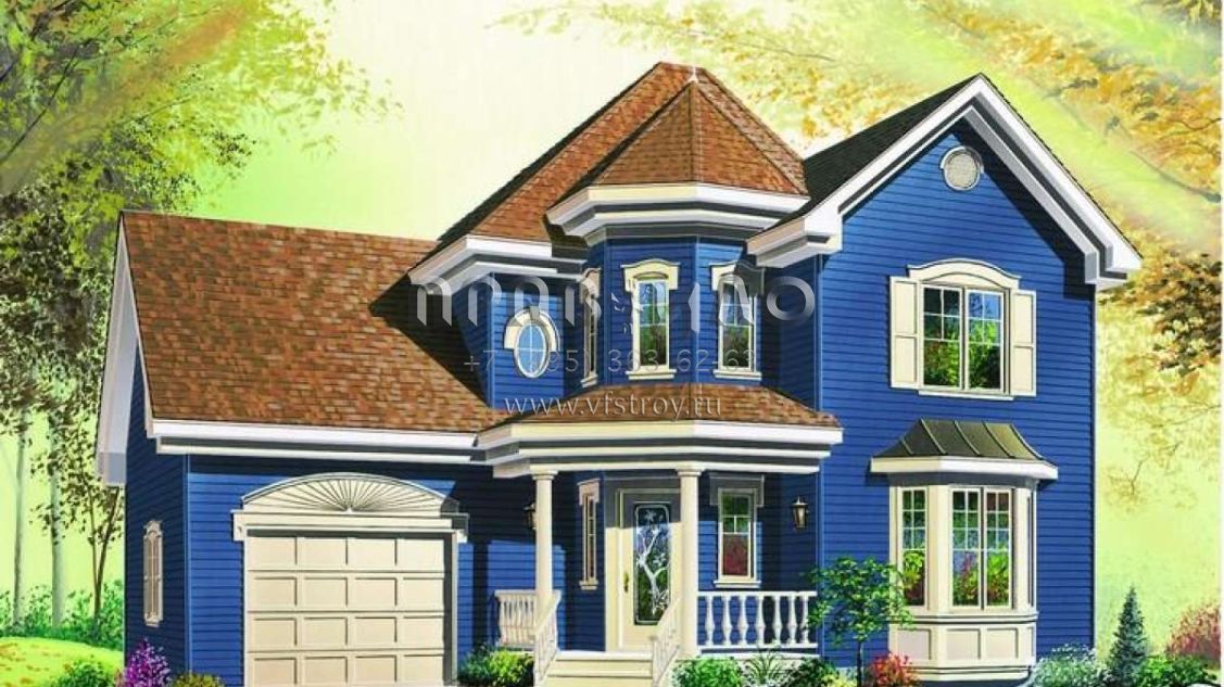 Это проект двухэтажного дома с гаражом на одну машину жилой площадью 148 кв.м. Длина дома 10.7 м, ширина 11.6 м, высота 9.1 м. В доме три спальни и один санузел.