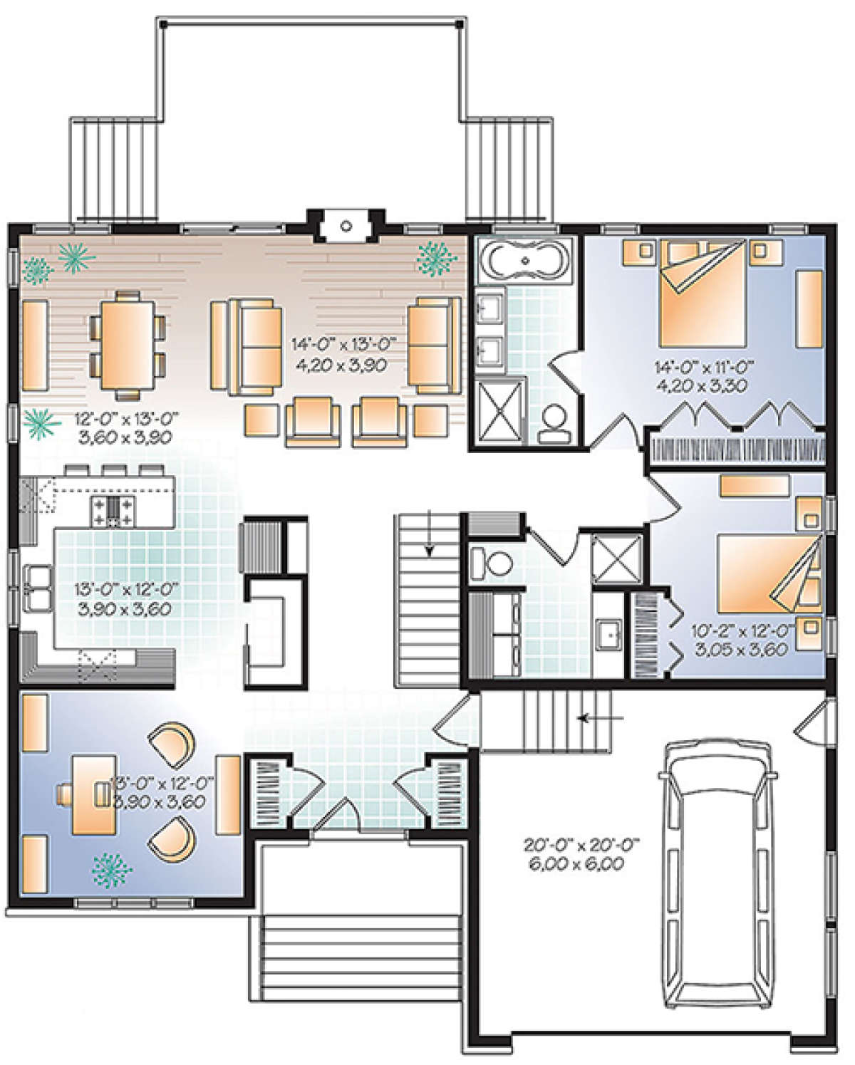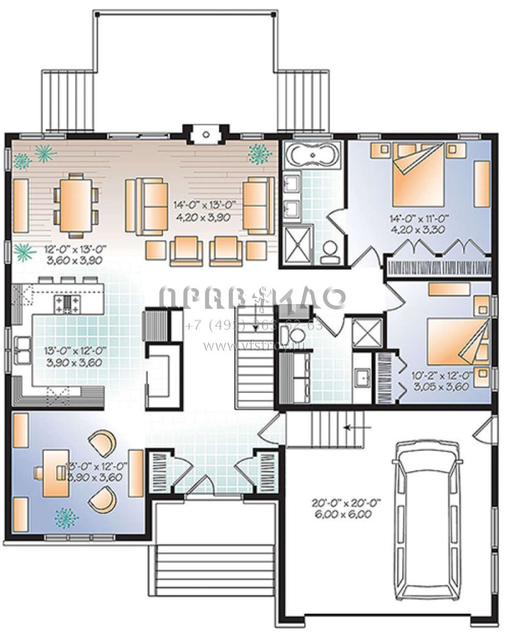 Это проект одноэтажного дома с гаражом на две машины жилой площадью 149 кв.м. Длина дома 14.6 м, ширина 14.6 м, высота 7 м. В доме две спальни и два санузла.