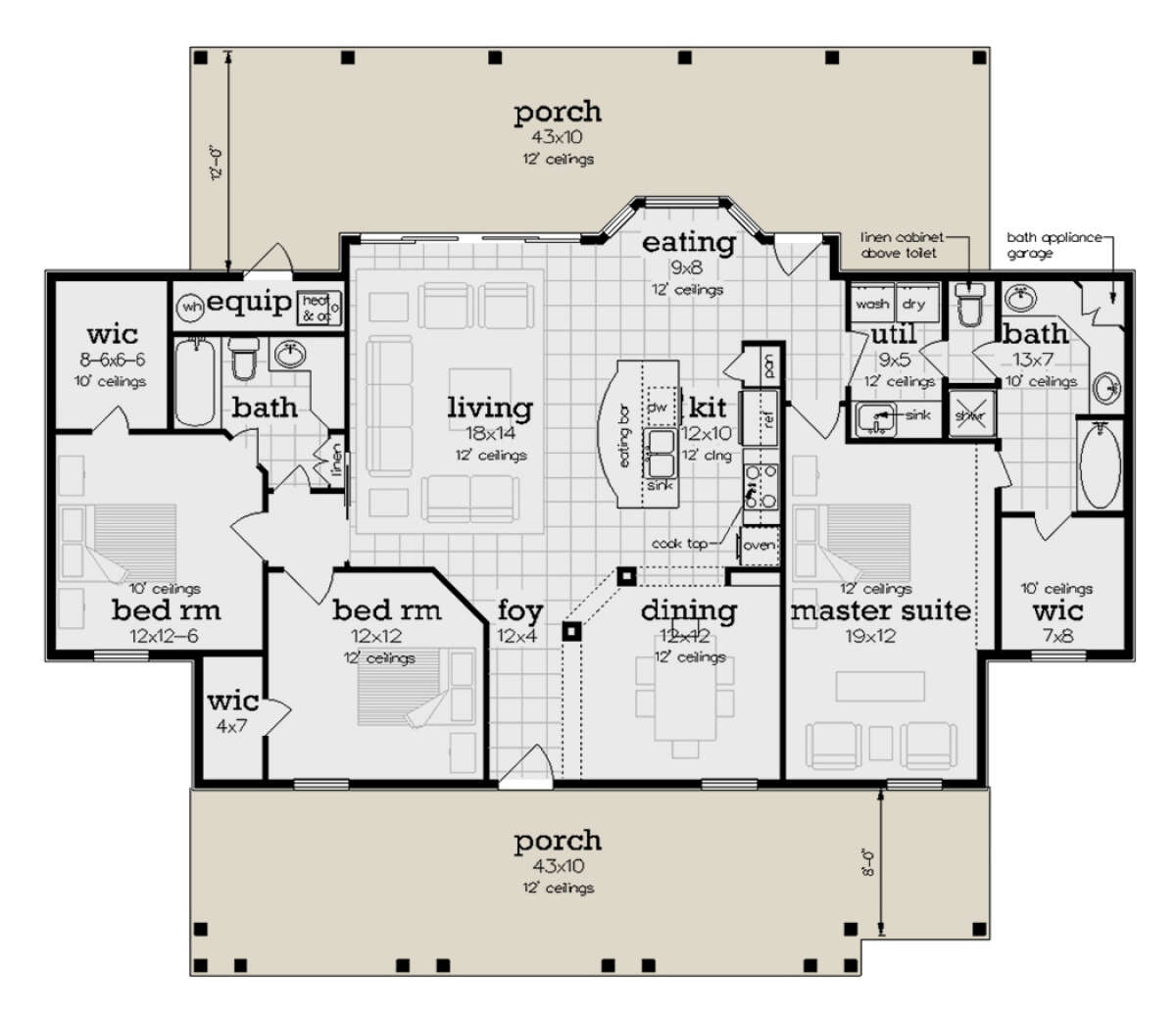 Это проект одноэтажного дома без гаража жилой площадью 149 кв.м. Длина дома 15.2 м, ширина 18 м, высота 9.8 м. В доме три спальни и два санузла.