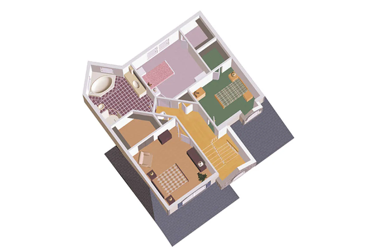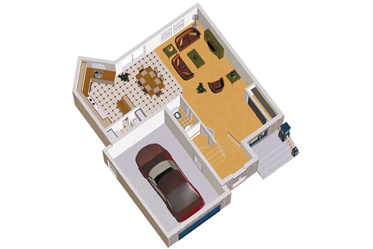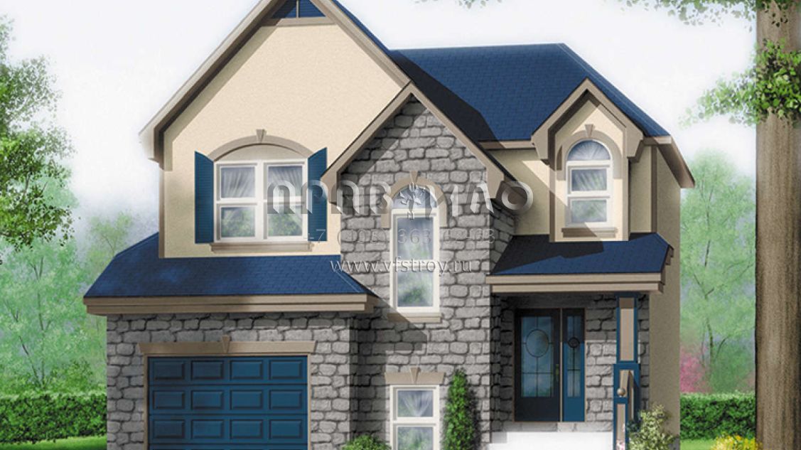 Двухэтажный проект дома позволяет рационально распорядиться площадью участка небольшого размера или узкой формы. На первом этаже находятся общие комнаты (гостиная/столовая, кухня, подсобные и технические помещения), на втором — спальни членов семьи.