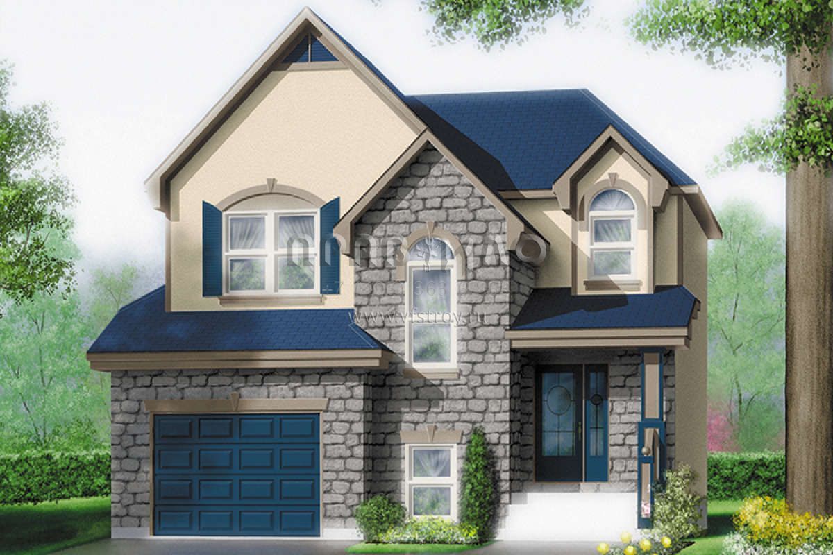 Это проект двухэтажного дома с гаражом на одну машину жилой площадью 149 кв.м. Длина дома 11.9 м, ширина 9.8 м, высота 9.1 м. В доме три спальни и один санузел.
