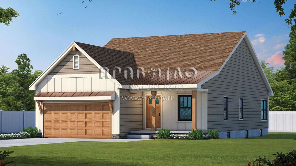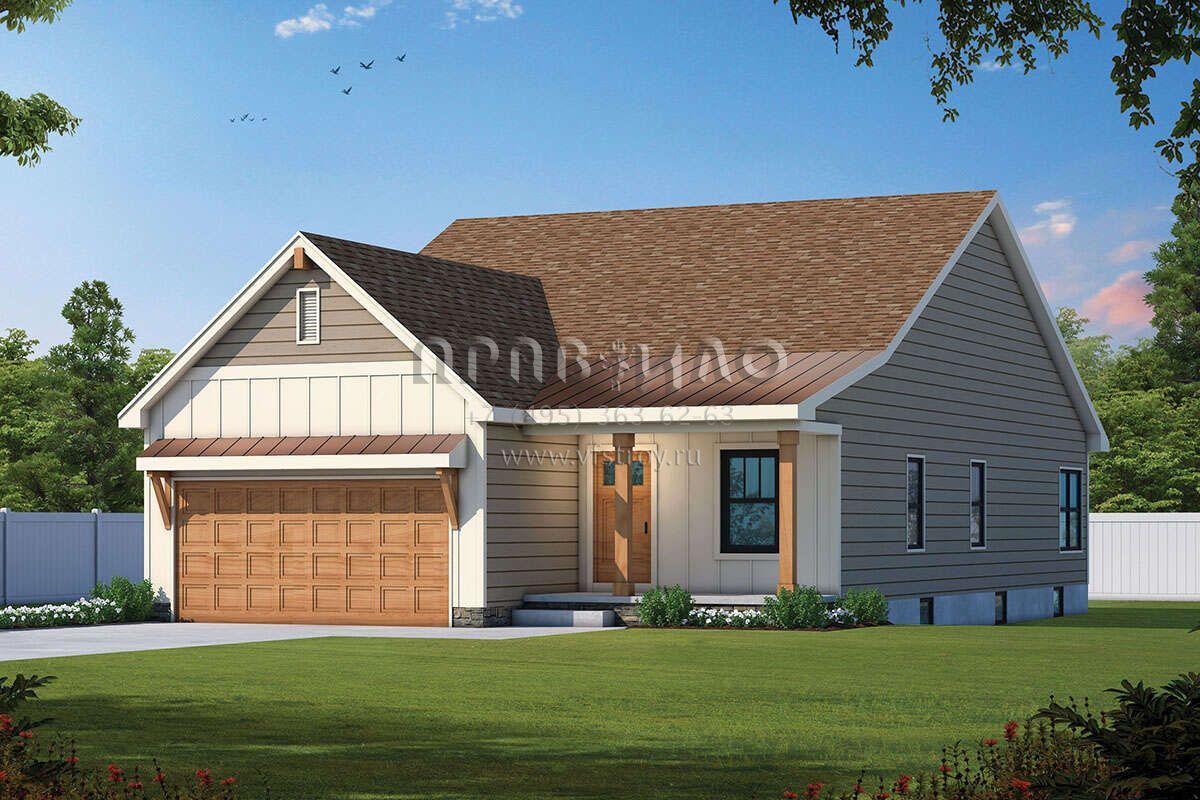 Это проект одноэтажного дома с гаражом на две машины жилой площадью 150 кв.м. Длина дома 19.5 м, ширина 10.4 м, высота 7.6 м. В доме три спальни и два санузла.
