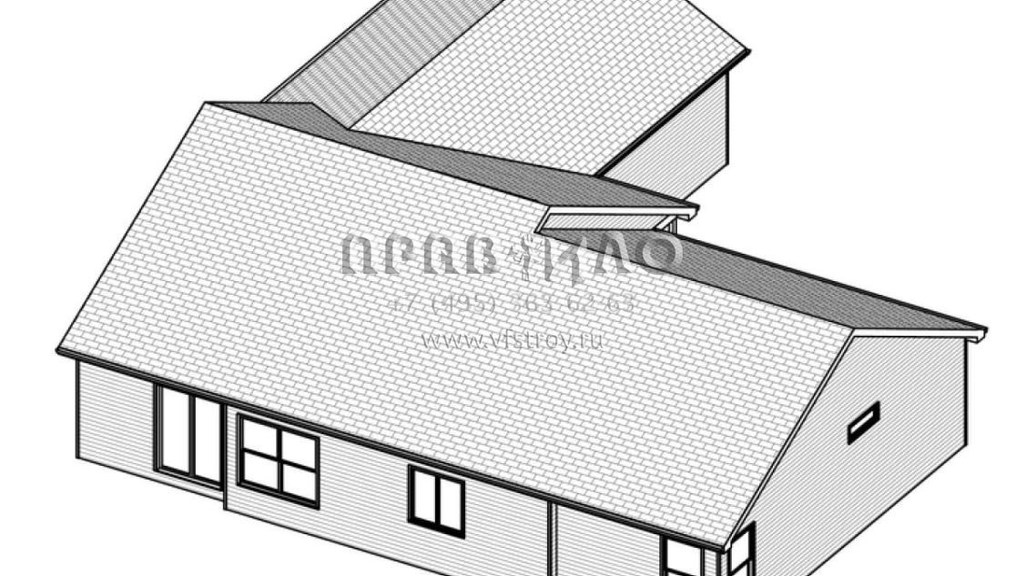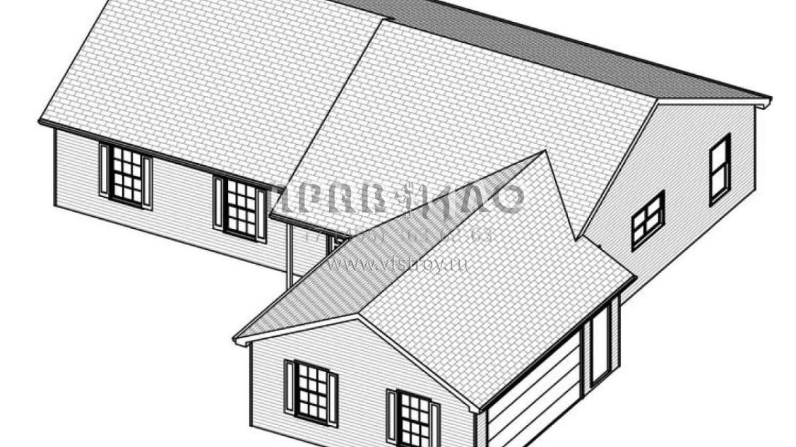 Это проект одноэтажного дома с гаражом на две машины жилой площадью 150 кв.м. Длина дома 17.4 м, ширина 16.8 м, высота 5.5 м. В доме три спальни и два санузла.
