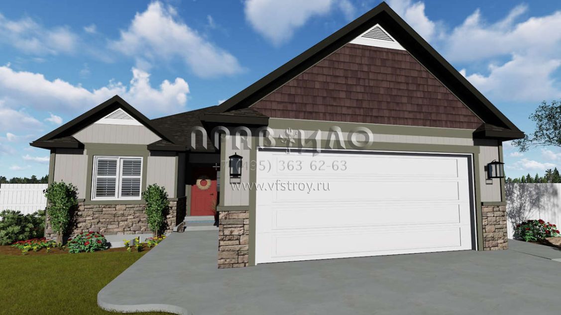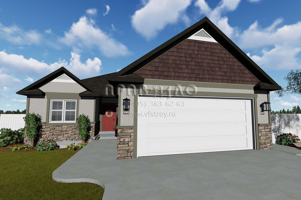 Это проект одноэтажного дома с гаражом на две машины жилой площадью 152 кв.м. Длина дома 19.5 м, ширина 12.5 м, высота 6.1 м. В доме три спальни и два санузла.