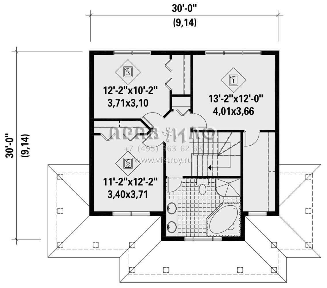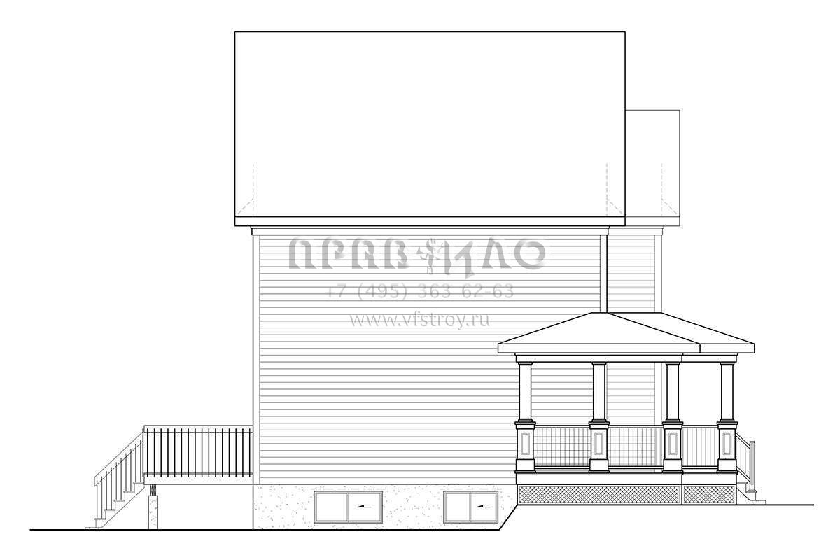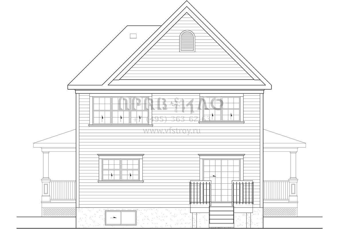 Это проект двухэтажного дома без гаража жилой площадью 155 кв.м. Длина дома 9.1 м, ширина 9.1 м, высота 10.4 м. В доме три спальни и один санузел.