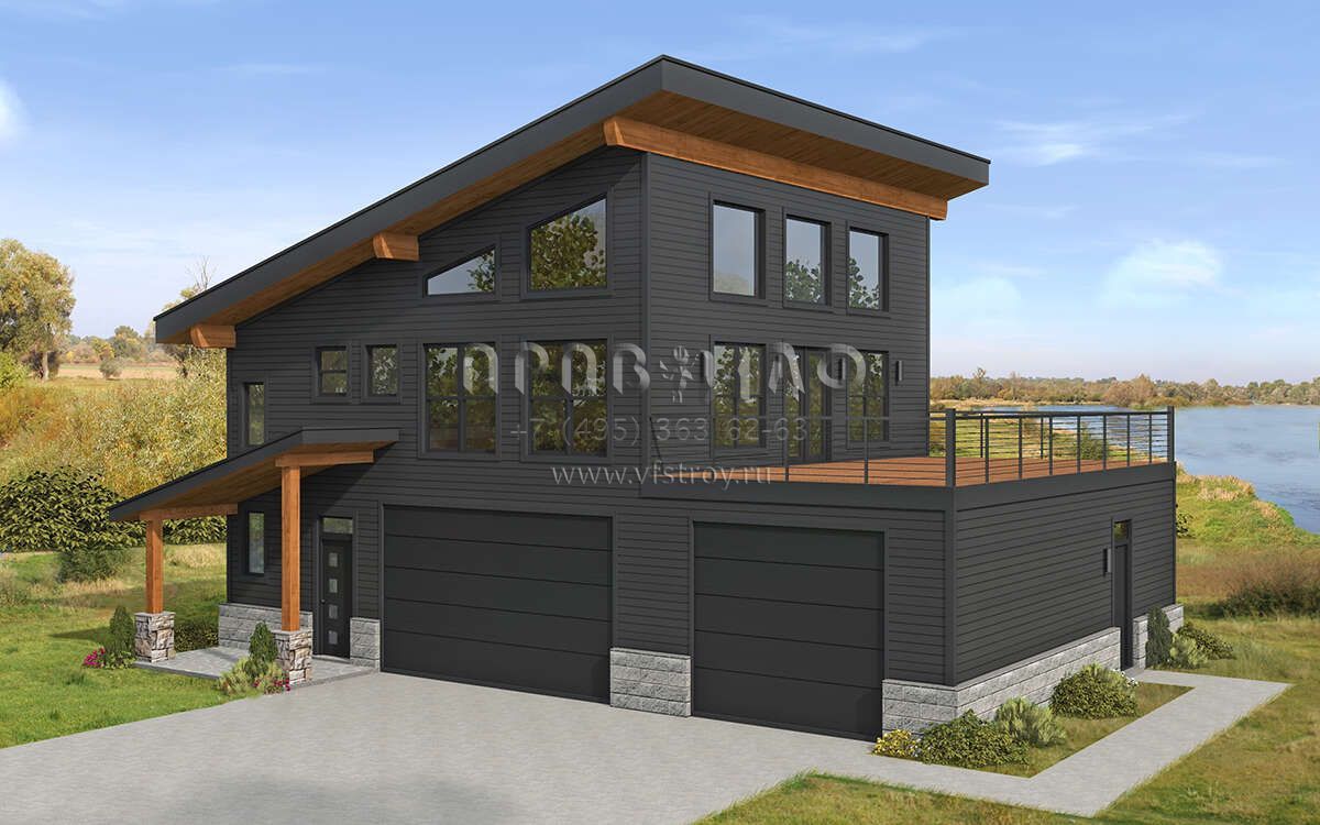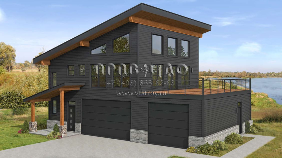 Это проект двухэтажного дома с гаражом на три и более машин жилой площадью 155 кв.м. Длина дома 14.3 м, ширина 9.8 м, высота 9.1 м. В доме две спальни и два санузла.