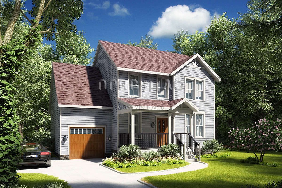 Это проект двухэтажного дома с гаражом на одну машину жилой площадью 156 кв.м. Длина дома 8.2 м, ширина 12.2 м, высота 9.1 м. В доме три спальни и два санузла.
