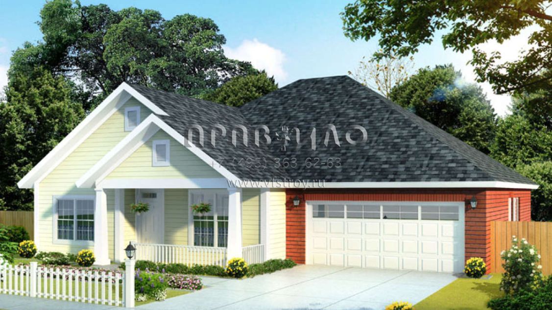 Это проект одноэтажного дома с гаражом на две машины жилой площадью 157 кв.м. Длина дома 16.2 м, ширина 14.9 м, высота 7.3 м. В доме четыре спальни и три санузла.