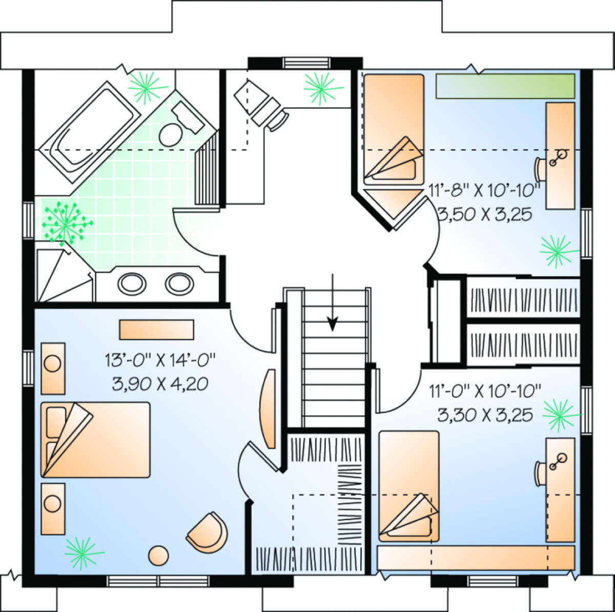 Это проект двухэтажного дома без гаража жилой площадью 158 кв.м. Длина дома 8.8 м, ширина 9.1 м, высота 8.8 м. В доме три спальни и один санузел.