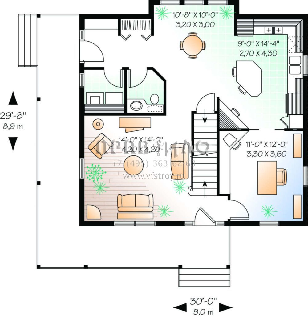 S5-158 (034-00119) Это иностранный проект, для которого требуется адаптация под нормы, действующие в Российской Федерации. Вы видите проект дома в стиле Ранчо. В этом доме сочетаются черты сельской постройки и аскетичность лофта. Внутри жильцы смогут проводить время с максимальным комфортом. Обратим внимание, что сейчас на планировках все размеры представлены в футах. Для перевода в метры вам необходимо значение в футах умножить на 0,3048.