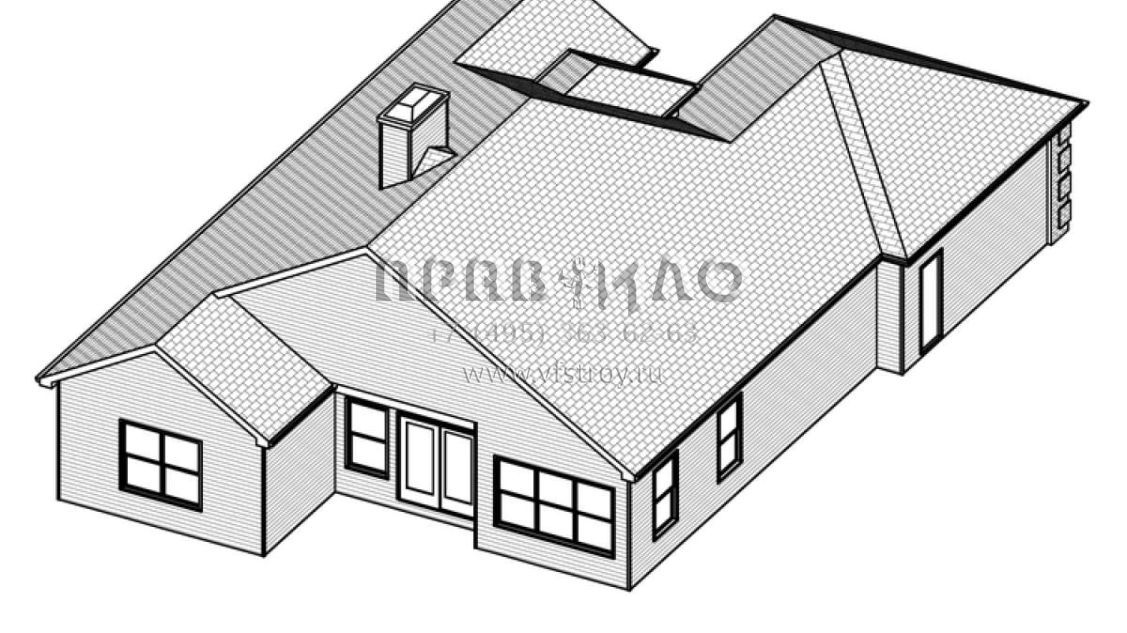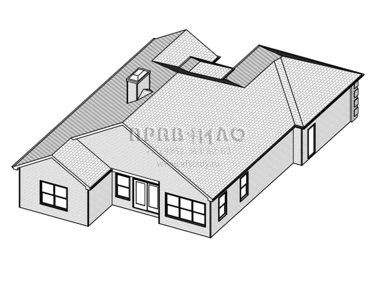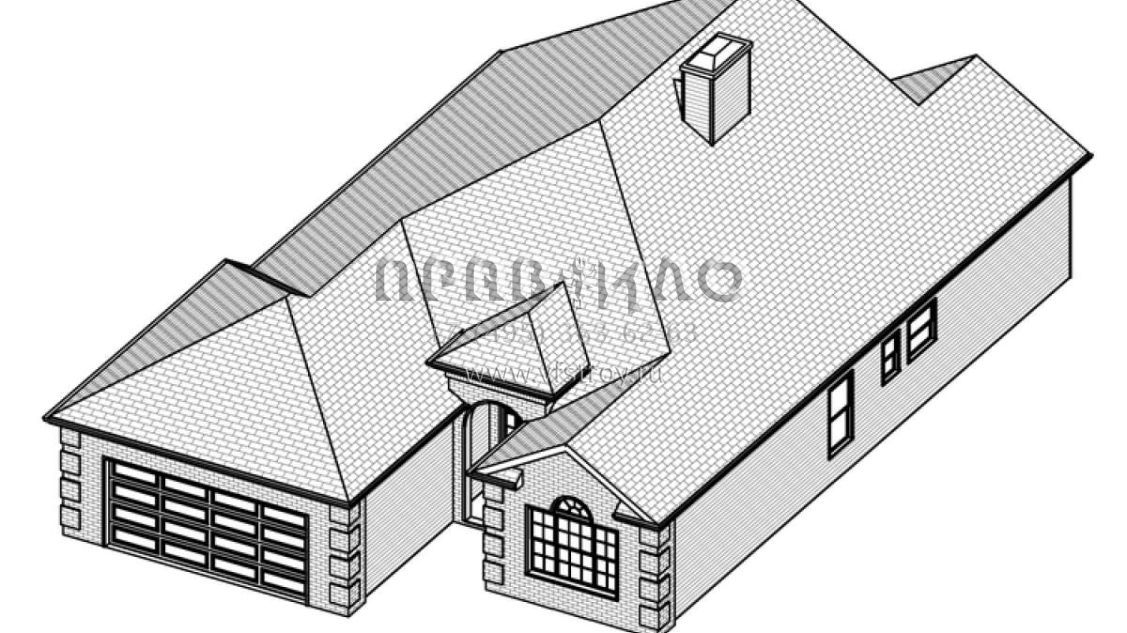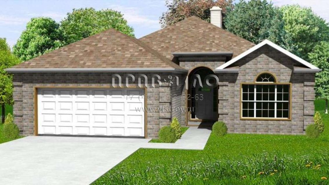 Это проект одноэтажного дома с гаражом на две машины жилой площадью 158 кв.м. Длина дома 19.8 м, ширина 12.8 м, высота 6.7 м. В доме три спальни и два санузла.