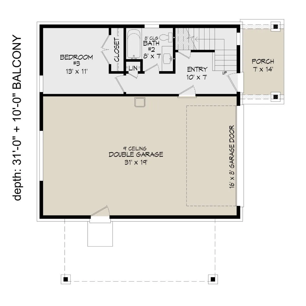 Это проект двухэтажного дома с гаражом на две машины жилой площадью 158 кв.м. Длина дома 9.4 м, ширина 9.8 м, высота 9.1 м. В доме три спальни и два санузла.