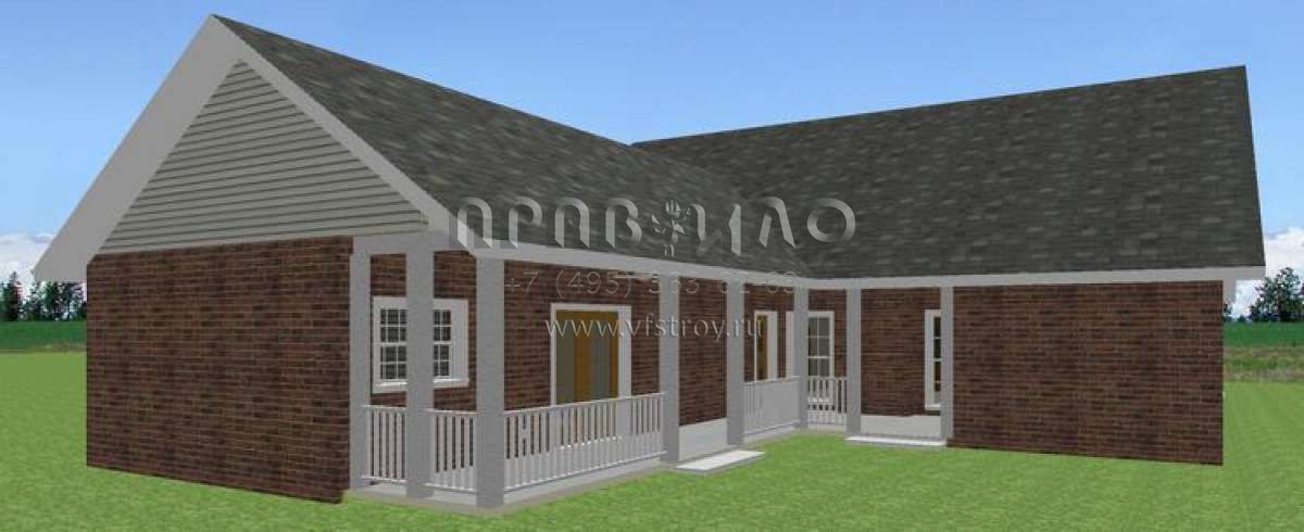 Это проект одноэтажного дома с гаражом на две машины жилой площадью 159 кв.м. Длина дома 19.8 м, ширина 13.4 м, высота 7.3 м. В доме три спальни и два санузла.