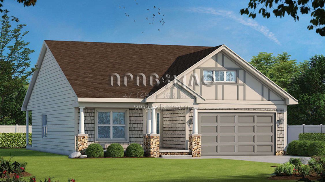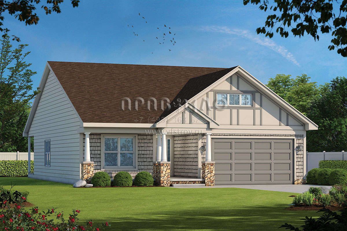 Это проект одноэтажного дома с гаражом на две машины жилой площадью 161 кв.м. Длина дома 19.8 м, ширина 12.5 м, высота 7.3 м. В доме две спальни и два санузла.