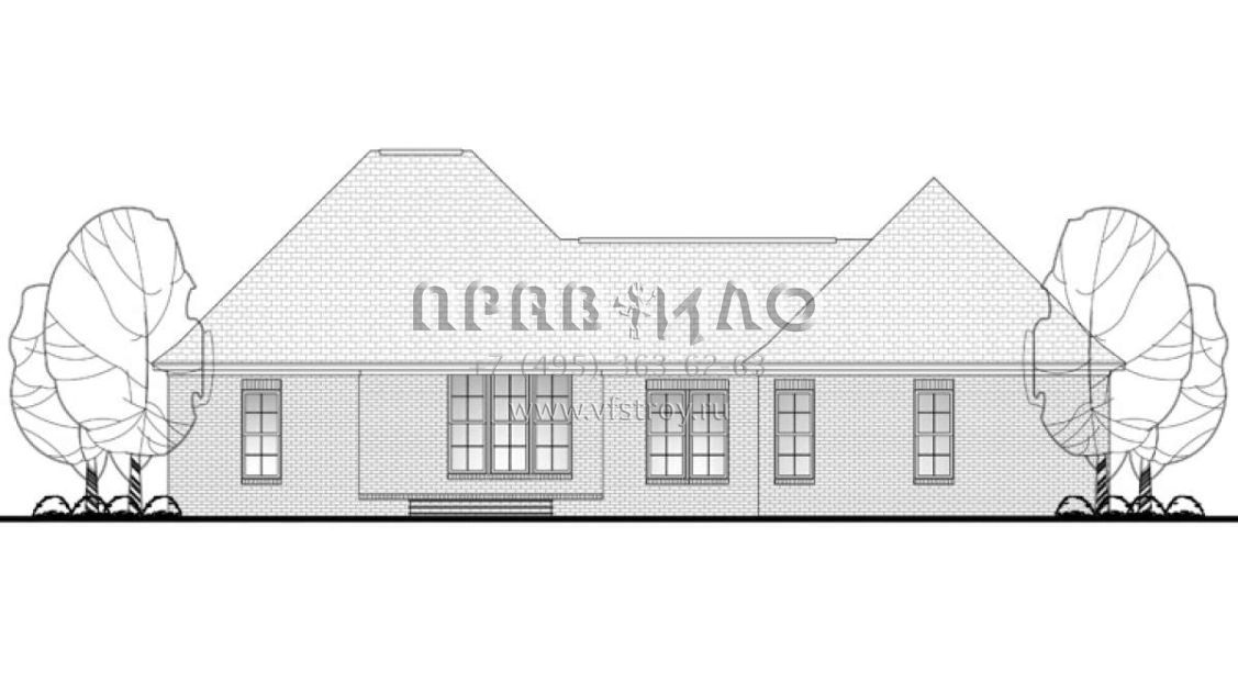 Это проект одноэтажного дома с гаражом на две машины жилой площадью 164 кв.м. Длина дома 14.9 м, ширина 18.9 м, высота 6.7 м. В доме три спальни и два санузла.