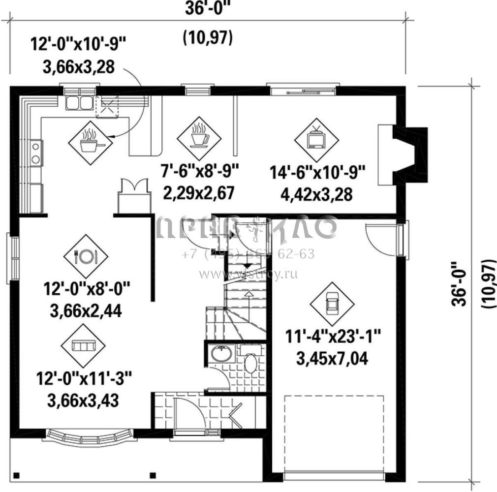 S5-164 (6146-00189) Это иностранный проект, для которого требуется адаптация под нормы, действующие в Российской Федерации. Вы видите проект дома в стиле Ранчо. В этом доме сочетаются черты сельской постройки и аскетичность лофта. Внутри жильцы смогут проводить время с максимальным комфортом. Обратим внимание, что сейчас на планировках все размеры представлены в футах. Для перевода в метры вам необходимо значение в футах умножить на 0,3048.