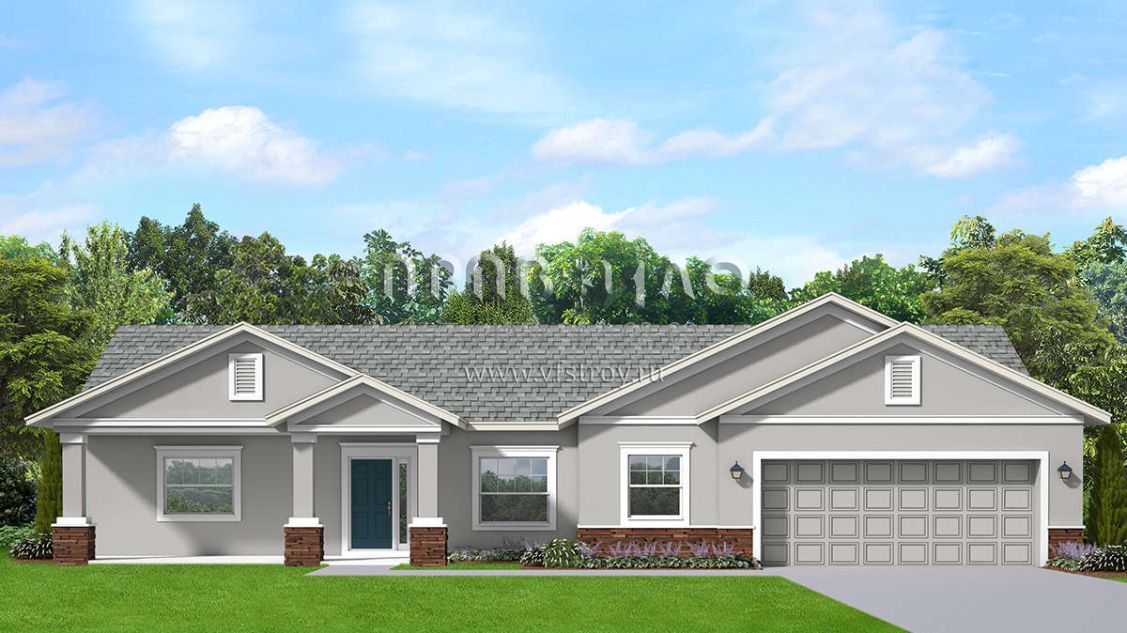Это проект одноэтажного дома с гаражом на две машины жилой площадью 166 кв.м. Длина дома 15.5 м, ширина 18.3 м, высота 5.2 м. В доме три спальни и два санузла.