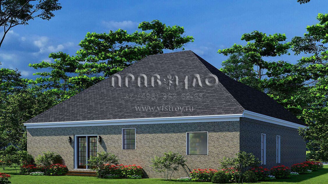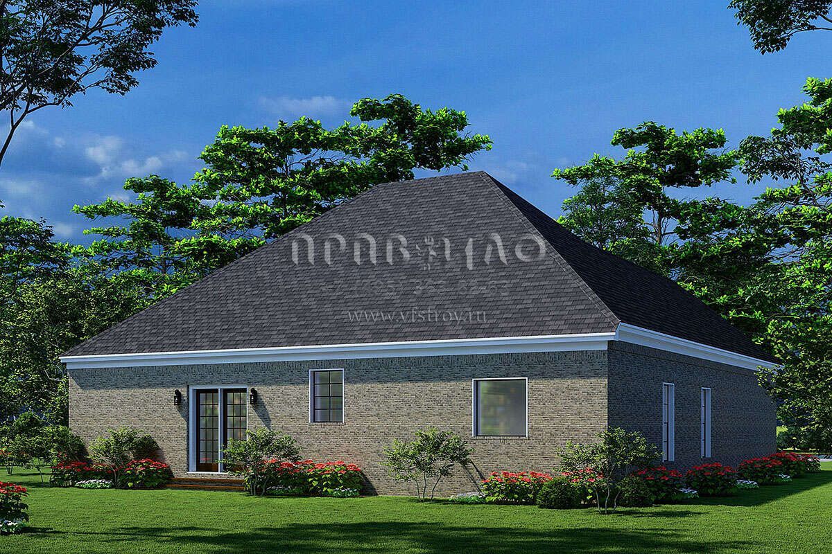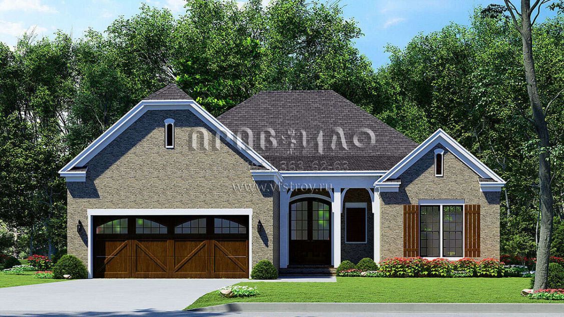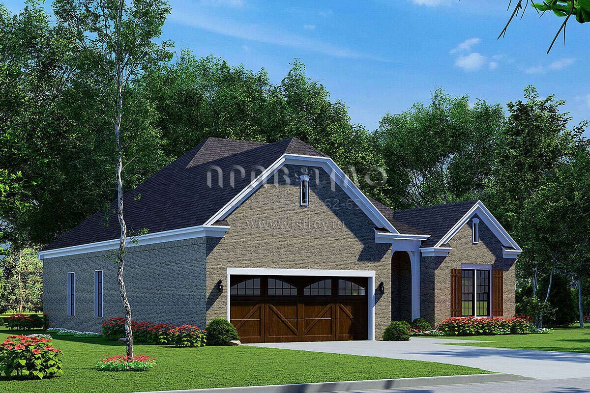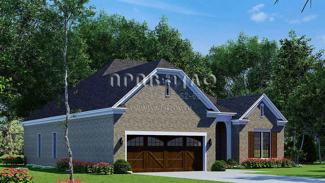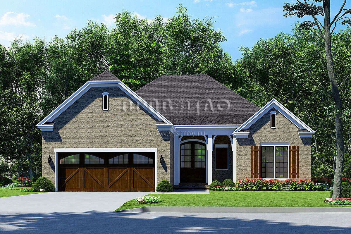 Это проект одноэтажного дома с гаражом на две машины жилой площадью 166 кв.м. Длина дома 16.5 м, ширина 14.3 м, высота 7.6 м. В доме четыре спальни и два санузла.