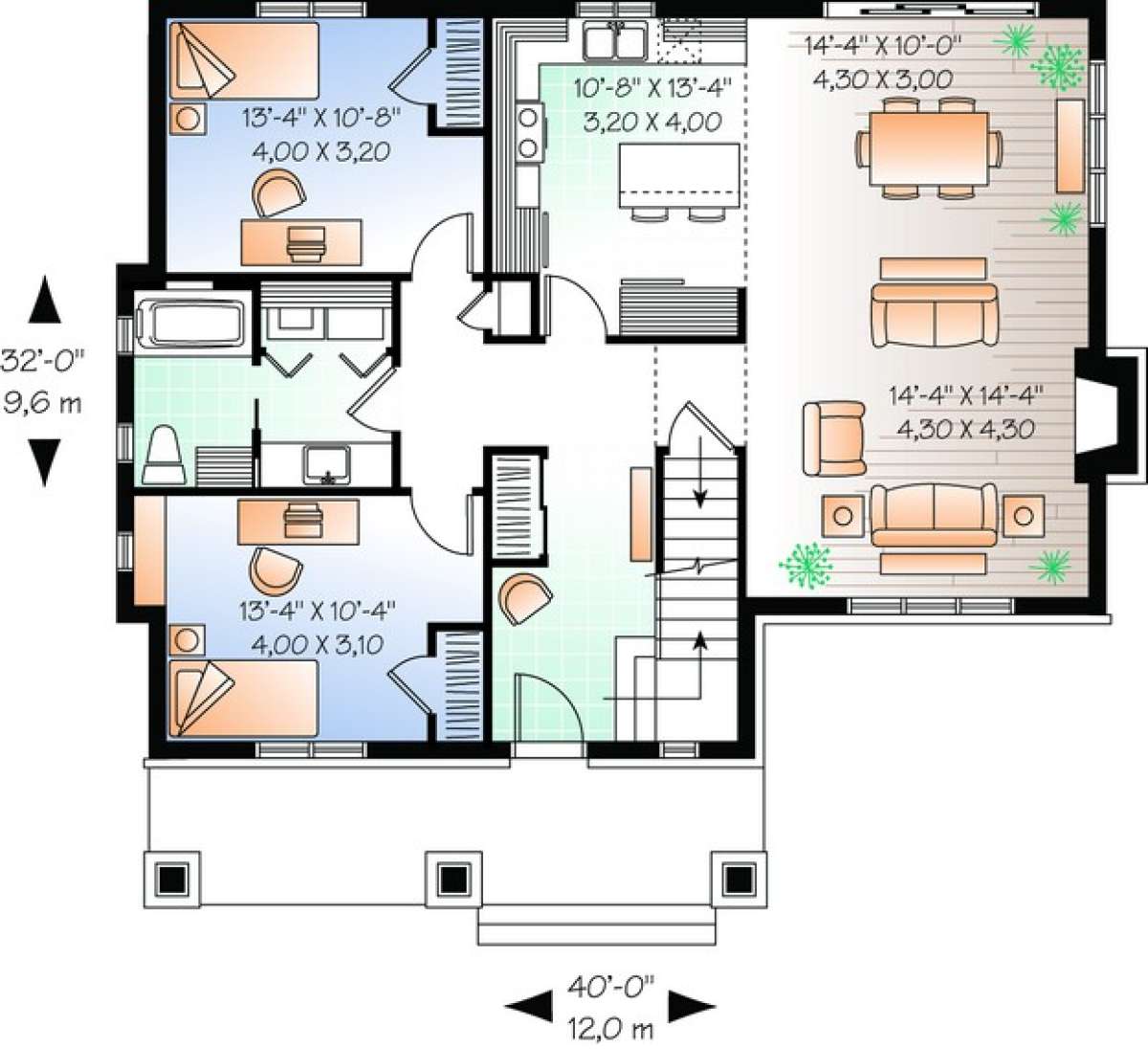 Двухэтажный проект дома позволяет рационально распорядиться площадью участка небольшого размера или узкой формы. На первом этаже находятся общие комнаты (гостиная/столовая, кухня, подсобные и технические помещения), на втором — спальни членов семьи.
